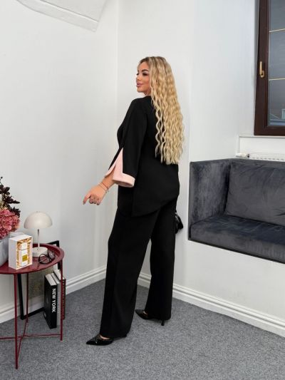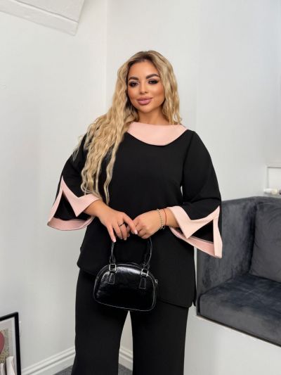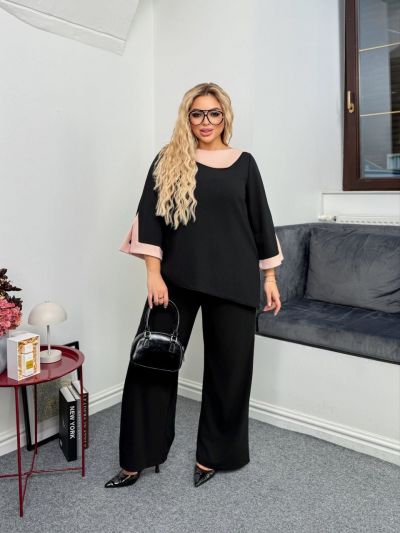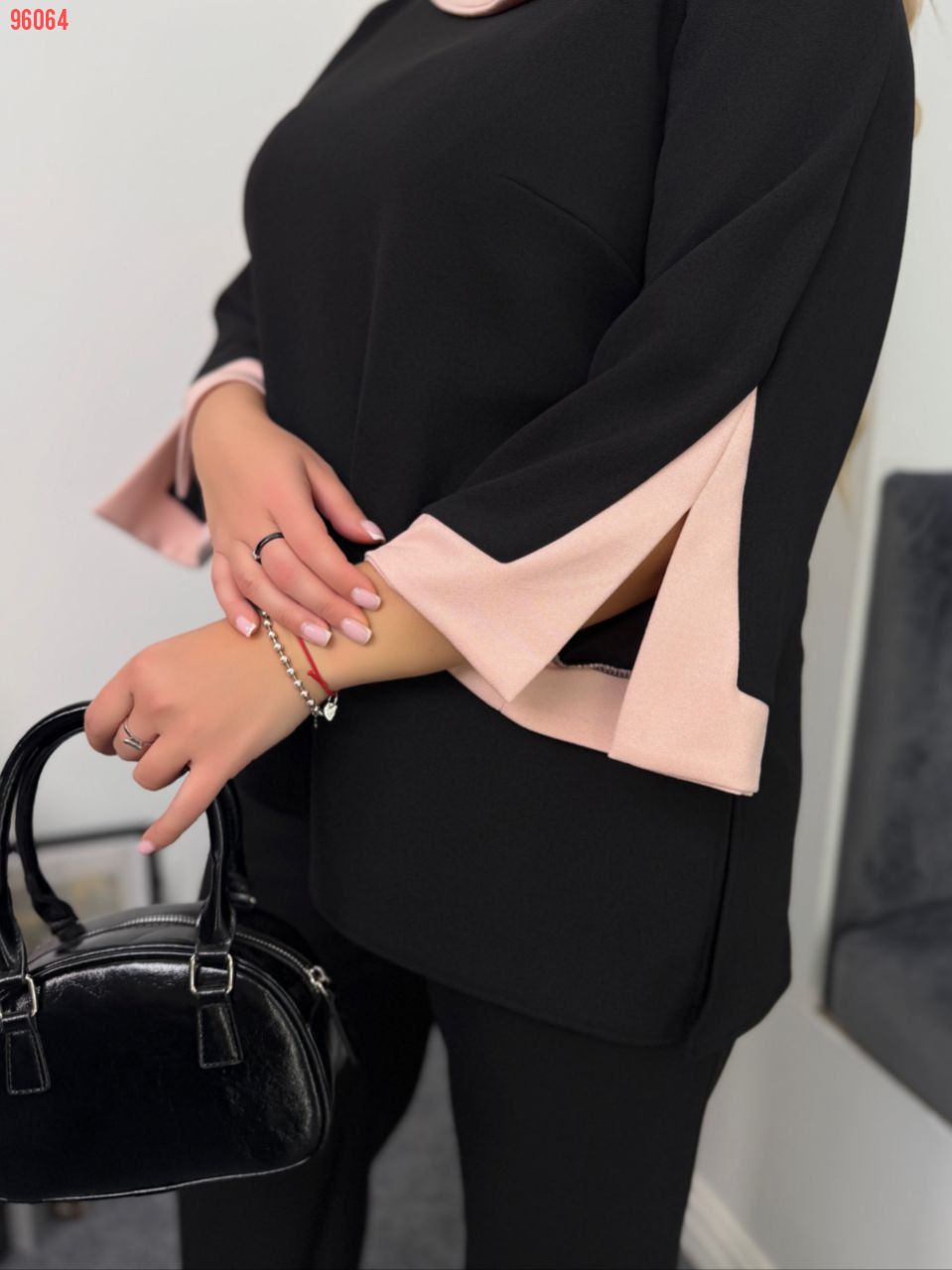 Комплект двійка, асиметрична кофтинка зі вставками пудрового кольору, з боків розрізи на рукавах та по низу кофти. Штани на резинці, вільні по ніжці, висока посадка.