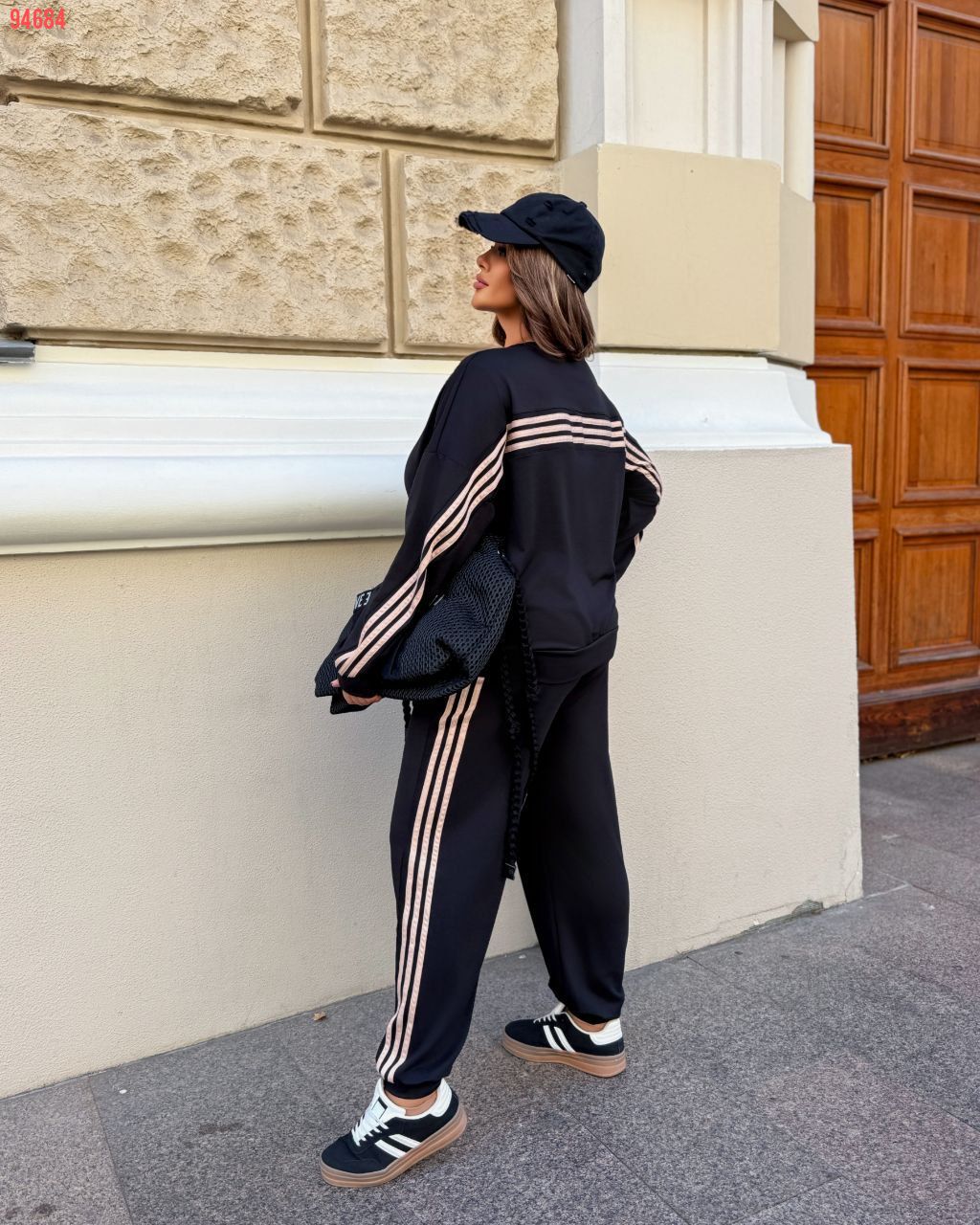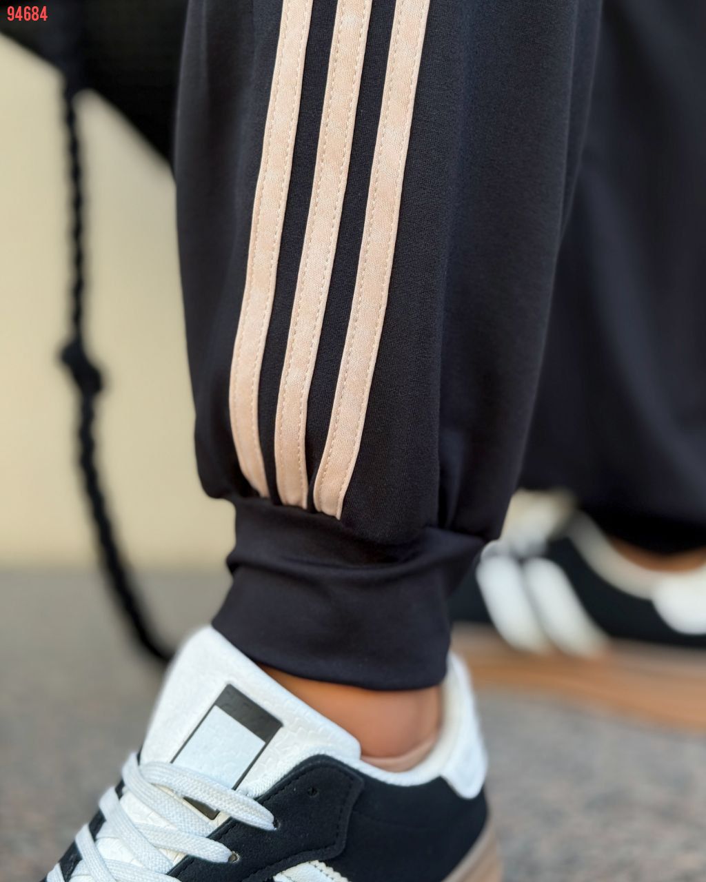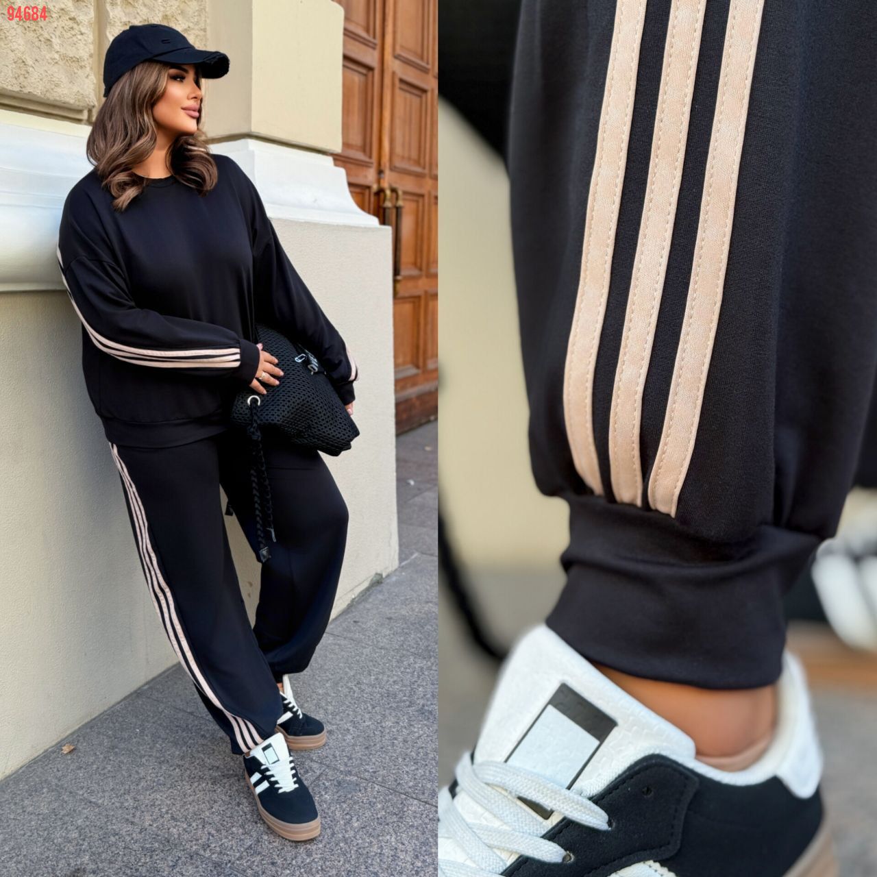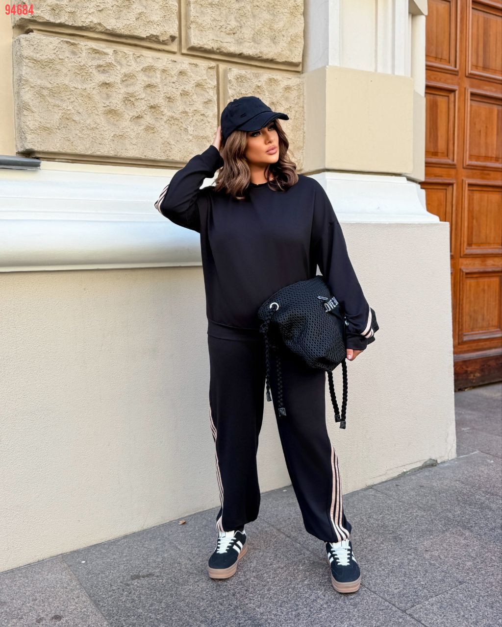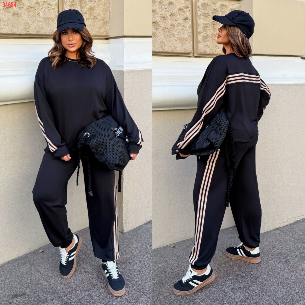 Стильний прогулянковий костюм, штани на високій посадці, кругова резинка, манжети. Кофтинка вільного крою, декорована стильними лампасами. Костюм виготовлений с двунитки, гарна розтяжність.