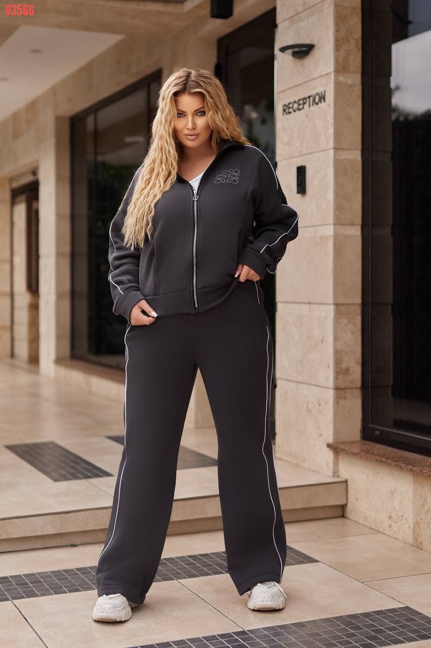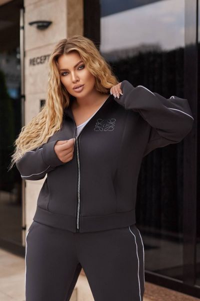 Кофта спереду має застібку молнію, на груді прикраса з камінчиками ( стрази),з врізними кишенями. На рукавах і на штанах - кантований лампас. Штани вільного крою , з кишенями, ідеальної посадки, в талії на гумці.