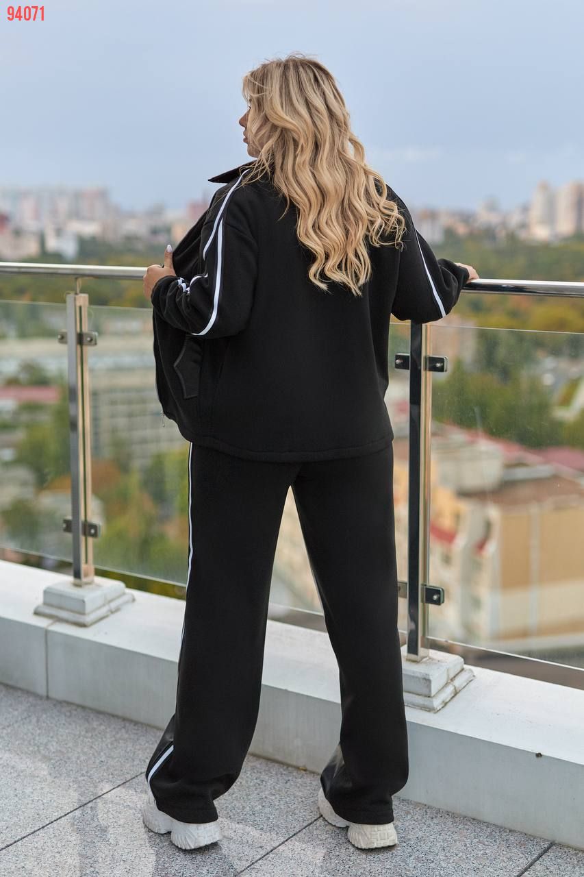 Кофта вільного крою, комір з бічними кишенями декоровані шкірою, з застібкою на блискавці, лампаси на рукавах,довгий спущений рукав, манжети на резинці. Брюки: висока посадка,прямий вільний крій, спереду вставки зі штучної шкіри, сзаду -тринитка, пояс на резинці, лампаси з боків.