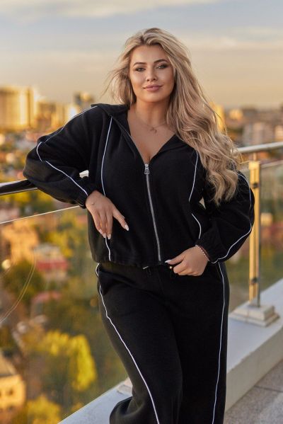 Кофта на блискавці з капюшоном вільного прямого крою, зручні кишені по боках, по низу на резинці з фіксатором,для коригування потрібного обʼєму і довжини. Кофта спереду і ззаду прикрашена кантом. Штани з кишенями, вільні,знизу на резинці з фіксацію, можна затягнути, по боках- подвійний лампас.