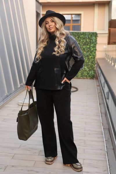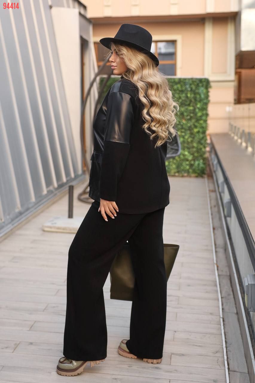 Костюм у стилі кежуал- ідеальне поєднання комфорту та елегантності. Вільний крій забезпечує зручність рухів, а вставки зі штучної шкіри додають образу сучасності та шарму. М’який трикотаж приємний до тіла, підходить для прохолодної погоди та створює бездоганний силует.