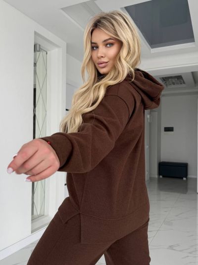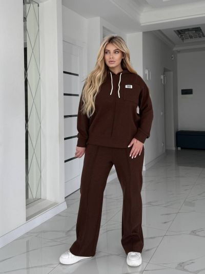 Стильний жіночий костюм у глибоких трендових відтінках– ідеальний вибір для тих, хто цінує комфорт і лаконічну елегантність. М’яка, приємна до тіла тканина забезпечує затишок у прохолодну погоду, а продуманий крій додає образу сучасності. Світлі шнурки на капюшоні створюють контрастний акцент, а акуратний логотип на грудях підкреслює брендований стиль. Широкі штани зі стрілками візуально подовжують ноги та забезпечують вільний рух.