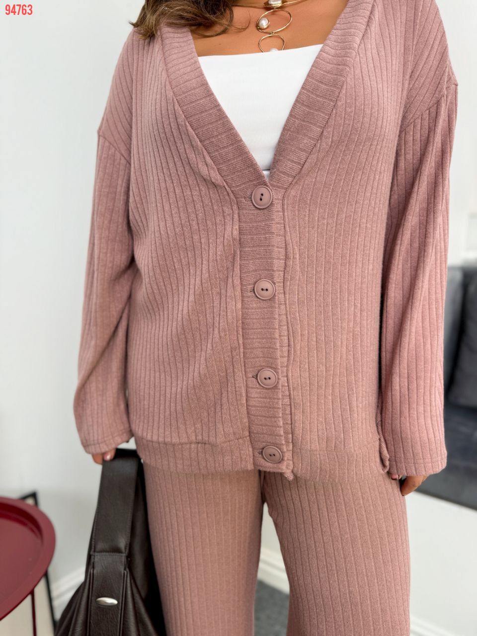Осінній прогулянковий костюм. Кофта+ Штани. на функціональних гудзиках, довгий рукав розширений. Штани на резинці розширені від стегна. Тканина в'язання трикотаж рубчик. Тканина м'яка, дуже приємна до тіла, добре тягнеться.