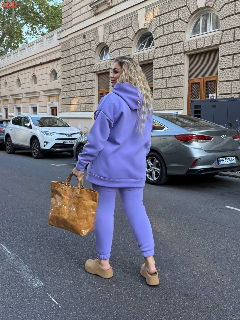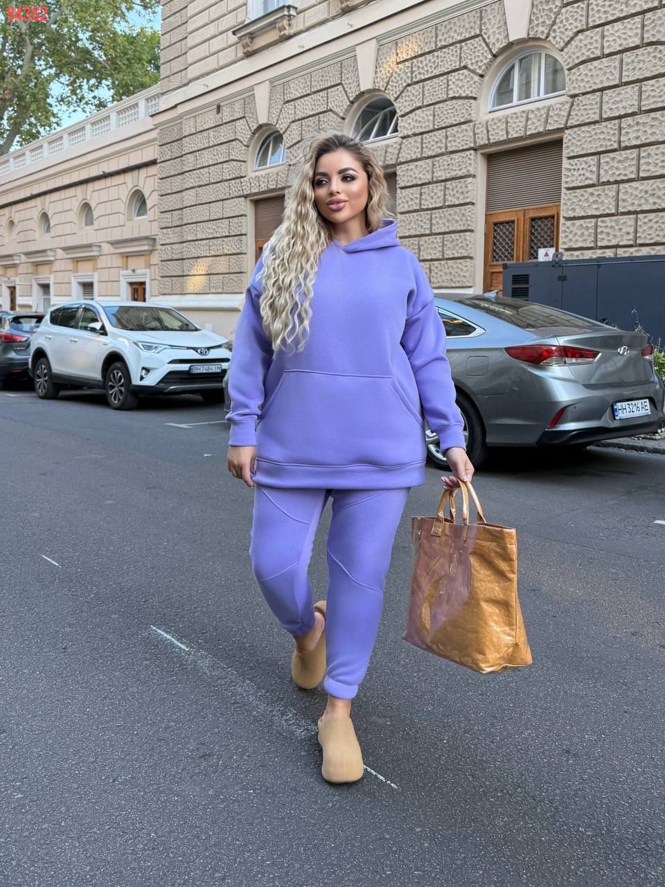 54-56 Ог 134, рукав 50, довжина кофти 75, довжина штанів 102, бедра 126, талія тягнеться до 126