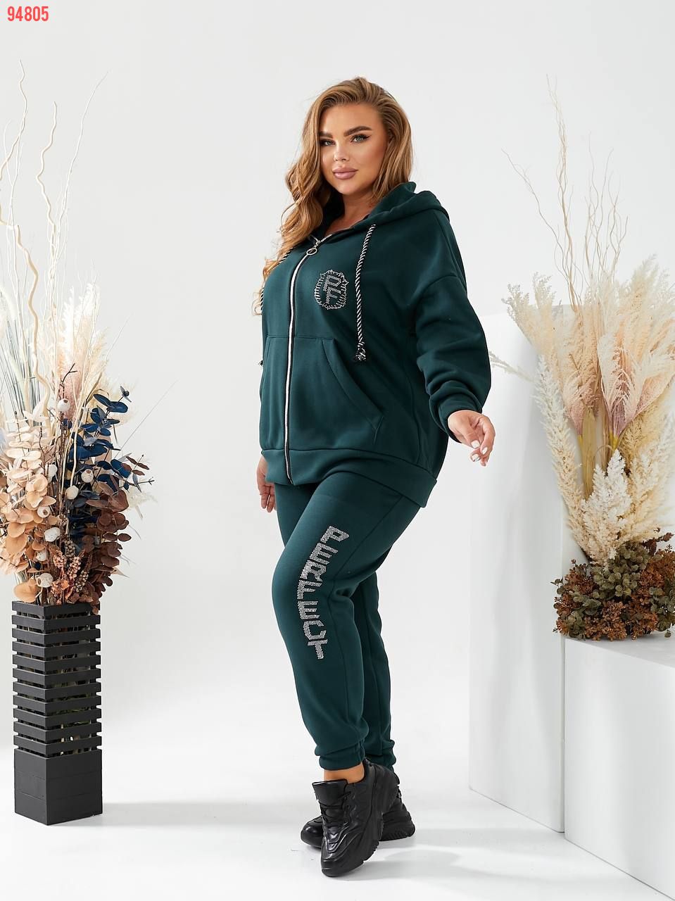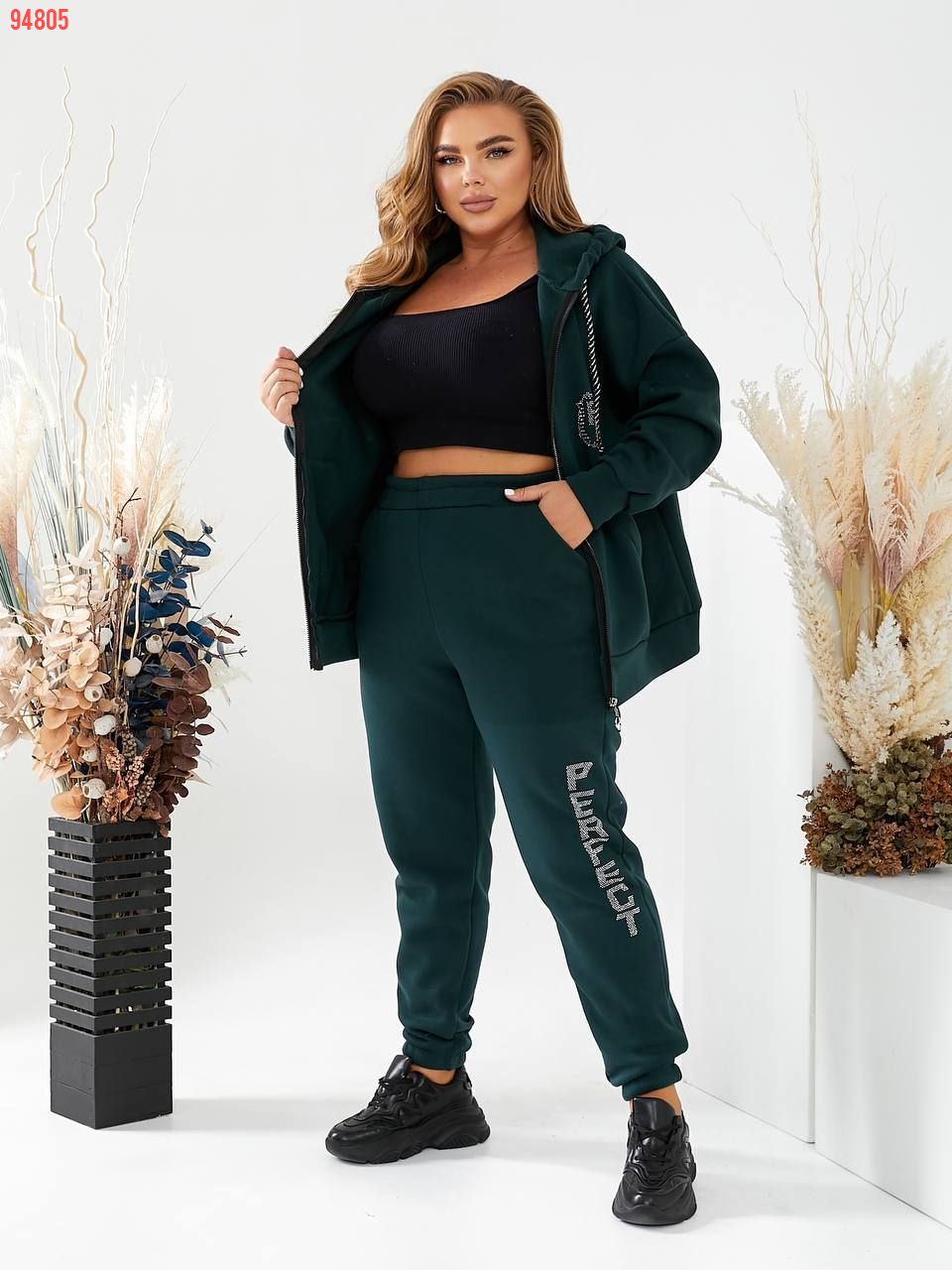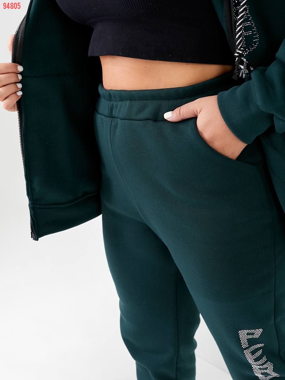 56-58: ог: 138 см, довжина кофти: 74 см, довжина рукава від горловини: 77 см. Штани з високою посадкою, пояс гумка 4 см, з боків кишені, декоровані камінням