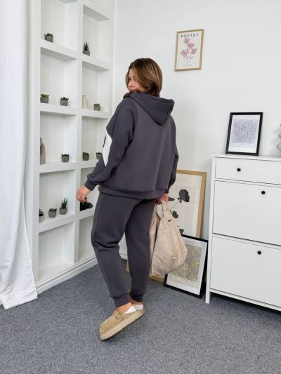 Спортивний костюм-це худи на блискавці з капюшоном, виконане з щільного тринитки. На грудях та рукавах є світлі вставки у вигляді геометричних форм, які додають образу динамічності. Худі має передні кишені та застібку на блискавку з кільцевим бігунком.