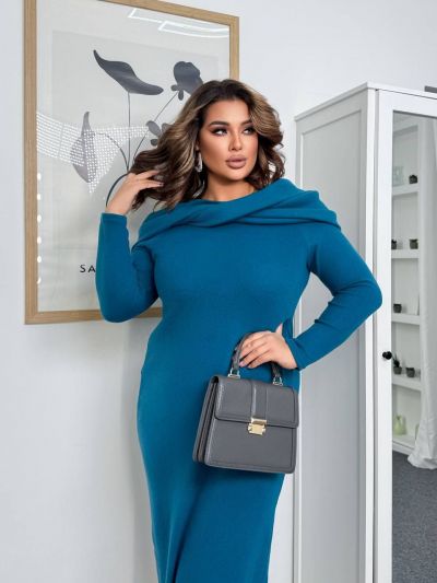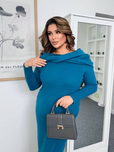Модель має силует, що облягає, довжиною міді, підкреслюючи фігуру. Верх прикрашений оригінальним коміром-хомутом, який м'яко драпірується і надає образу жіночності та затишку. Рукави довгі, без манжет. Елегантний, але комфортний повсякденний образ у стилі casual chic.