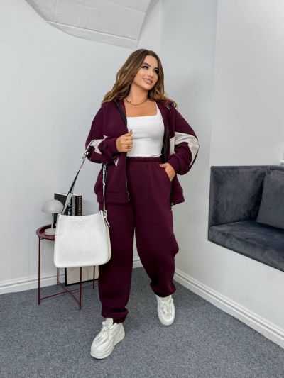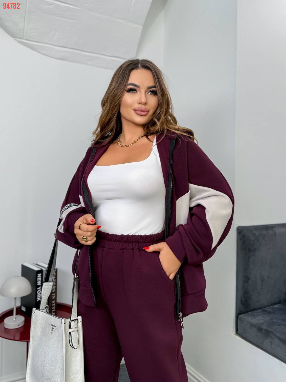 Спортивний костюм-це худи на блискавці з капюшоном, виконане з щільного тринитки. На грудях та рукавах є світлі вставки у вигляді геометричних форм, які додають образу динамічності. Худі має передні кишені та застібку на блискавку з кільцевим бігунком.