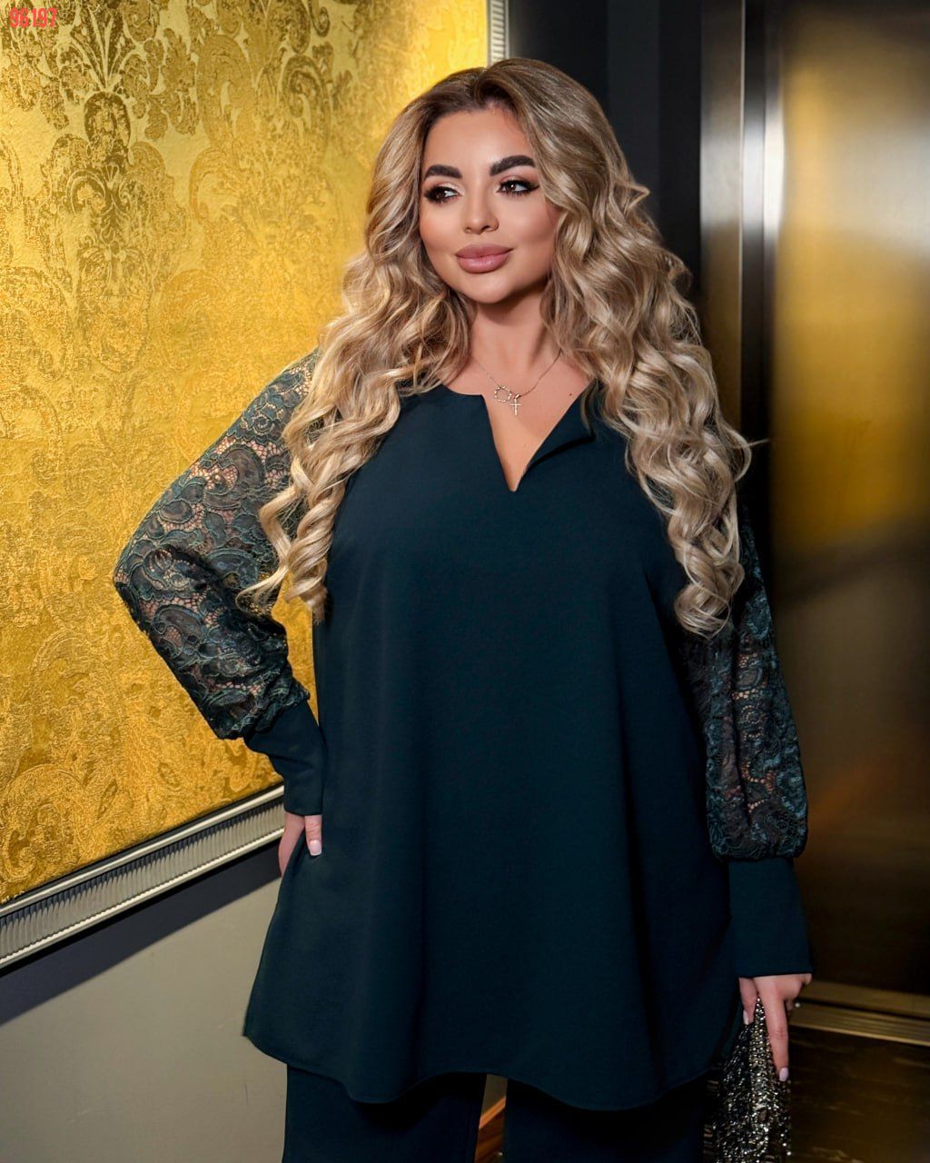 Туніка А-подібного силуету, завдяки чому чудово приховує будь-які недоліки фігури та підкреслює переваги. Горловина оригінальної форми. Рукави із гарного гіпюру в тон основної тканини, на манжетах. З боків невеликі розрізи. Застібок, кишень немає.