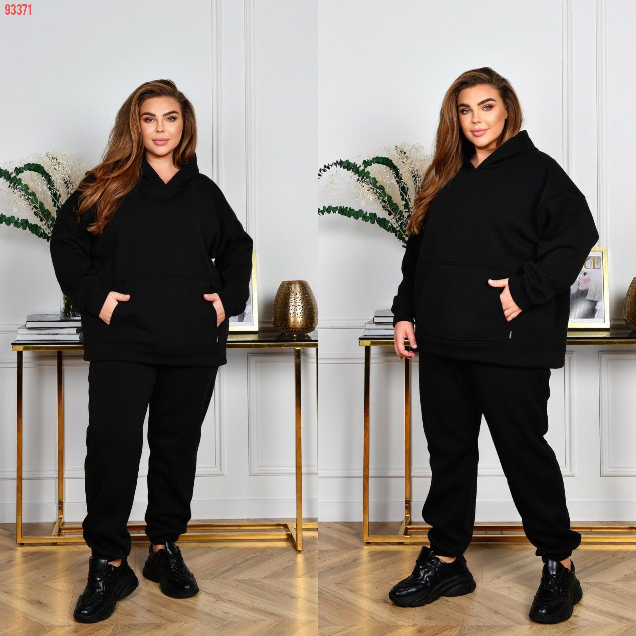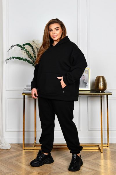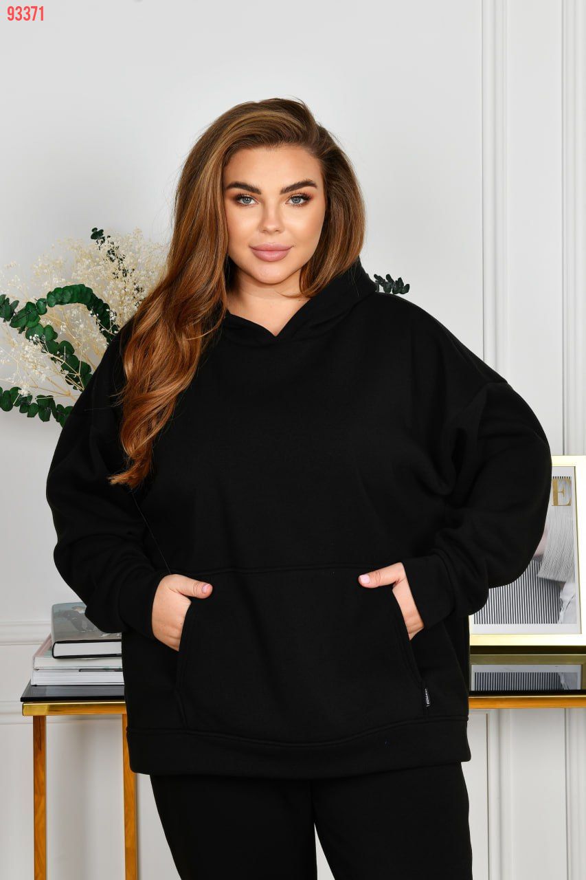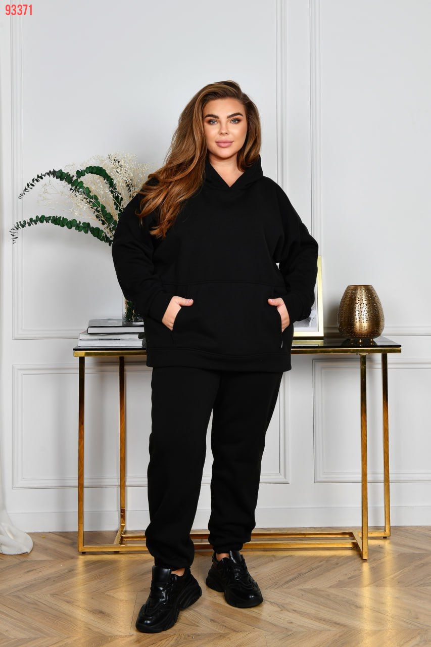 Немовірно стильний тепленький костюм для прогулянок із якісного турецького трикотажу тринитки з начосом ( не кошлатиться, розтяжність середня). Худі з капюшоном, силует прямий вільний. Лінія плеча спущена. Рукави на манжетах. На передній полочці кишеня «кегуру». Штани з посадкою, вищою за середню. По талії зібрані на резинку. Низ штанів також на резинці. В бічних швах оброблені кишені.