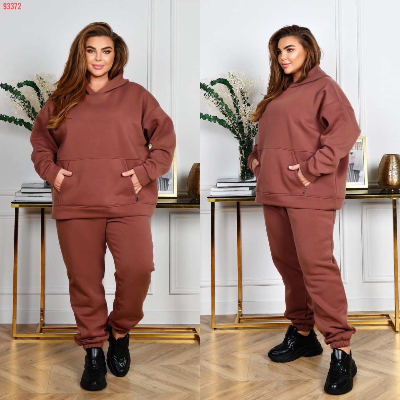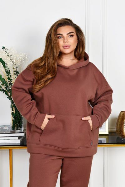 Худі з капюшоном, силует прямий вільний. Лінія плеча спущена. Рукави на манжетах. На передній полочці кишеня «кегуру».