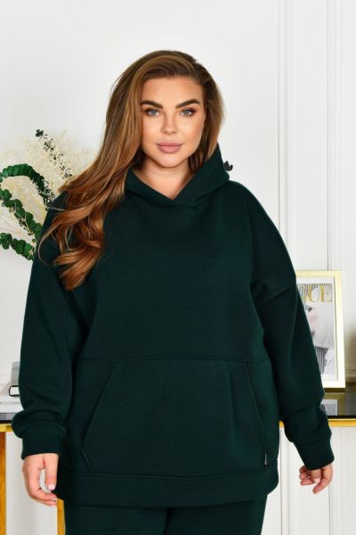 Худі з капюшоном, силует прямий вільний. Лінія плеча спущена. Рукави на манжетах. На передній полочці кишеня «кегуру».