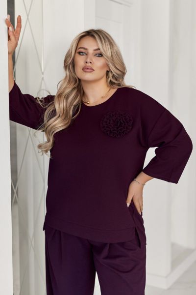 Туніка вільного прямого силуету, виріз горловини круглий, рукав 3/4. Низ асиметричний, з невеликими розрізами. Туніку декоровано трояндою із основної тканини (за потреби можна зняти). Кишень та застібок немає.