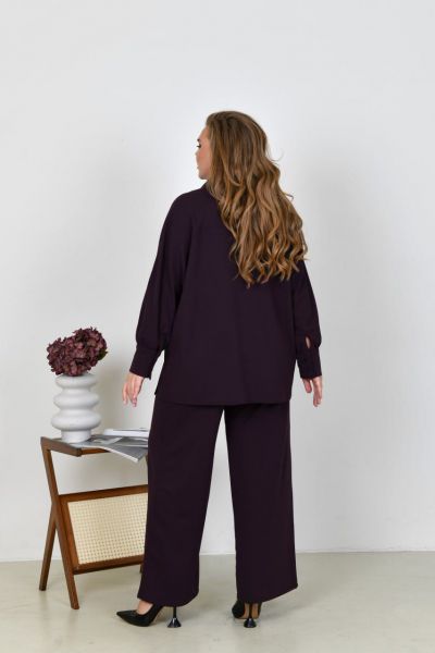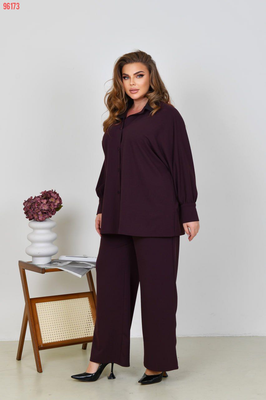 Стильний та вишуканий костюм-двійка із якісного трикотажу крепдайвінг (розтяжність середня). Сорочка вільного прямого силуету, комірець стояче-відкладений. Застібається на гудзики по передній планці. З боків невеликі розрізи. Рукав довгий, на манжеті, застібається на гудзик. Брюки-палаццо по лінії талії зібрані на резинку, в бічних швах оброблені кишені.