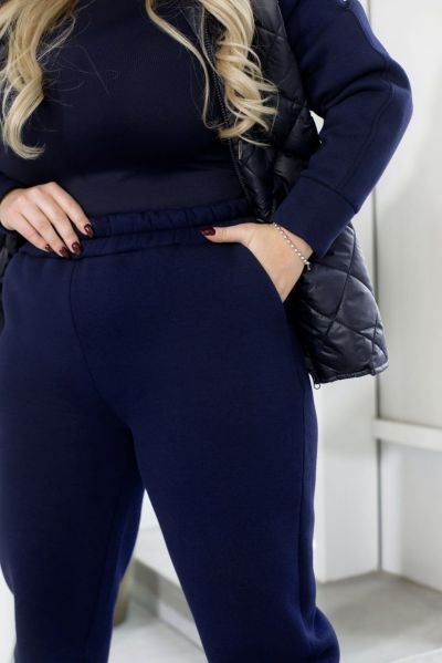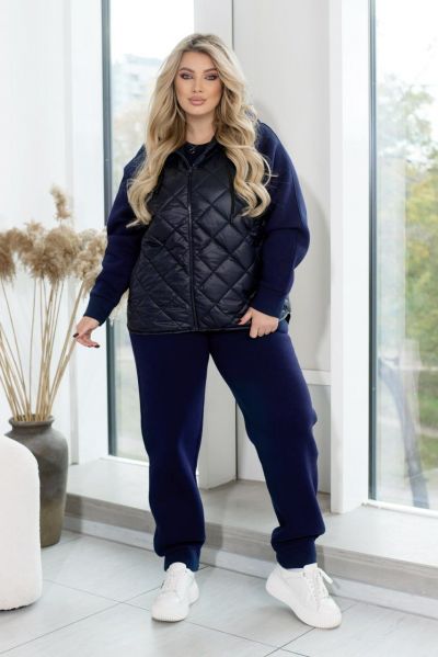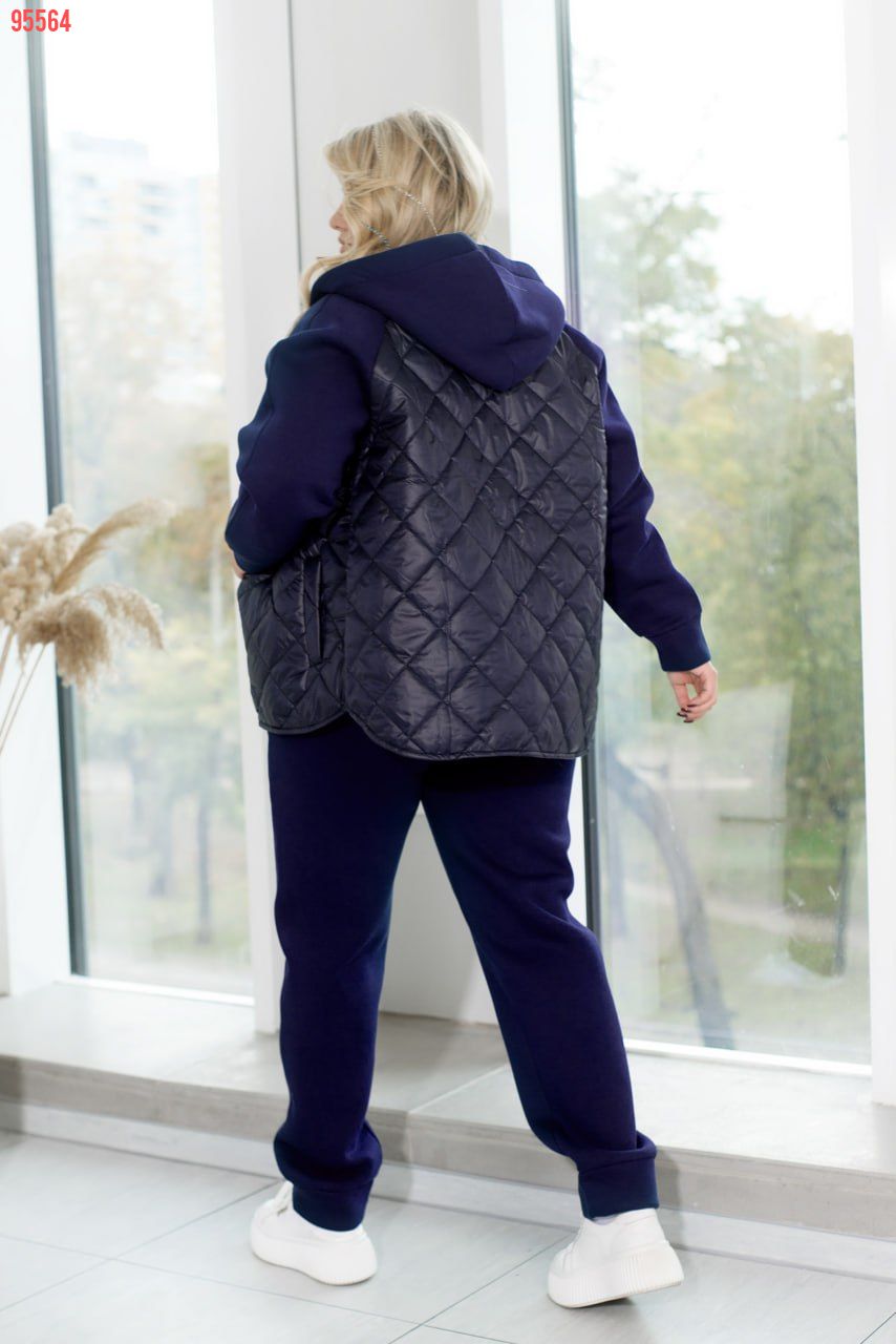 Спортивний костюм із кофтою на змійці, пошитий із поєднання тканин "стежка" та трьохнитки, створений для комфорту та стилю. Кофта оснащена капюшоном зі шнурком, що проходить через люверси, забезпечуючи захист і регулювання. Спереду розташовані врізні кишені для зручності. Рукава з трьохнитки з манжетами забезпечують комфортну посадку. Штани з високою посадкою на еластичній гумці з боковими кишенями і манжетами внизу додають функціональності та забезпечують тепло. Ідеальний вибір для активного відпочинку чи повсякденних занять.
