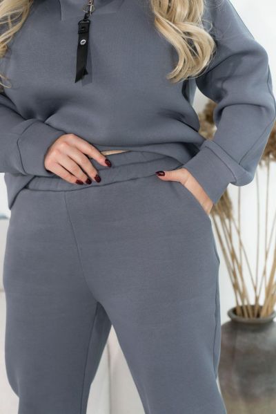 Спортивний костюм із трьохнитки на флісі забезпечує ідеальне поєднання тепла та комфорту в прохолодну погоду. Худі має зручну змійку і високу горловину, що ефективно захищає шию від холоду. Довгі рукави з манжетами забезпечують комфортну посадку та зберігають тепло. Штани з високою посадкою на еластичній гумці підкреслюють фігуру та забезпечують максимальну свободу рухів. Манжети внизу штанів додають стильного вигляду та додаткового тепла. Бокові кишені роблять костюм практичним і зручним для щоденного носіння або активного відпочинку. На моделі представлений розмір 50-52