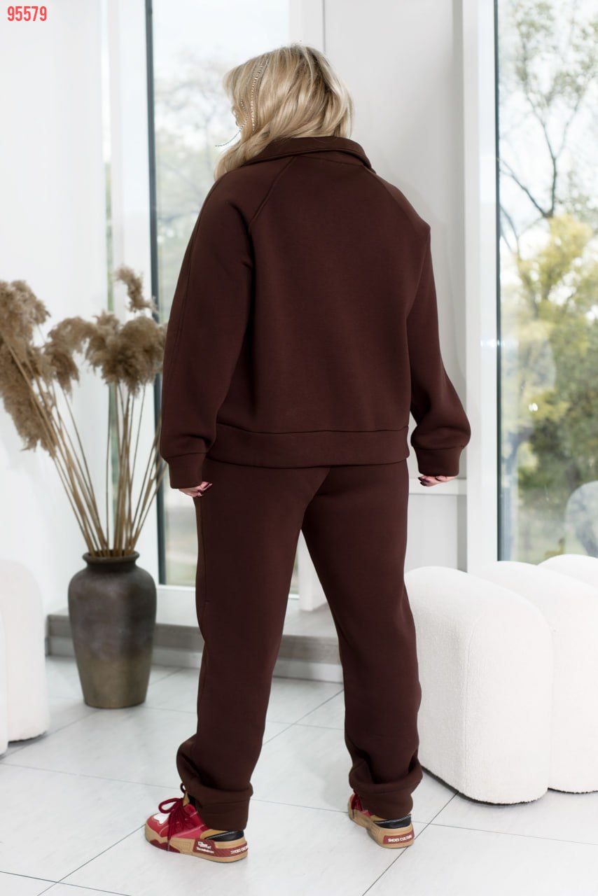 Спортивний костюм із трьохнитки на флісі забезпечує ідеальне поєднання тепла та комфорту в прохолодну погоду. Худі має зручну змійку і високу горловину, що ефективно захищає шию від холоду. Довгі рукави з манжетами забезпечують комфортну посадку та зберігають тепло. Штани з високою посадкою на еластичній гумці підкреслюють фігуру та забезпечують максимальну свободу рухів. Манжети внизу штанів додають стильного вигляду та додаткового тепла. Бокові кишені роблять костюм практичним і зручним для щоденного носіння або активного відпочинку.