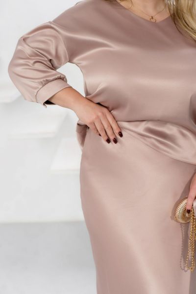 Елегантний святковий костюм зі спідницею, створений із розкішного костюмного шовку, стане вашим ідеальним образом для новорічних свят. Він поєднує витонченість і комфорт, роблячи вас зіркою будь-якої святкової події. Блуза з V-подібним вирізом створює акцент на зоні декольте, додаючи образу жіночності. Спущена лінія плечей та рукави довжиною 3/4 з манжетами на ґудзиках забезпечують стильний вигляд і зручність. Довга спідниця на резинці комфортно сідає по фігурі, а текстильний пояс, що входить до комплекту, дозволяє підкреслити талію та додає завершеності образу. Цей костюм створений, щоб ви відчували себе впевнено й виглядали розкішно під час зустрічі Нового року чи будь-якого іншого особливого заходу.