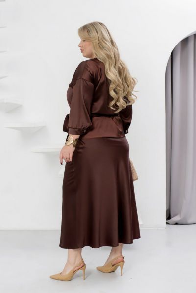 Елегантний святковий костюм зі спідницею, створений із розкішного костюмного шовку, стане вашим ідеальним образом для новорічних свят. Він поєднує витонченість і комфорт, роблячи вас зіркою будь-якої святкової події. Блуза з V-подібним вирізом створює акцент на зоні декольте, додаючи образу жіночності. Спущена лінія плечей та рукави довжиною 3/4 з манжетами на ґудзиках забезпечують стильний вигляд і зручність. Довга спідниця на резинці комфортно сідає по фігурі, а текстильний пояс, що входить до комплекту, дозволяє підкреслити талію та додає завершеності образу. Цей костюм створений, щоб ви відчували себе впевнено й виглядали розкішно під час зустрічі Нового року чи будь-якого іншого особливого заходу.