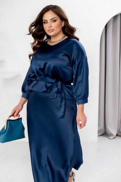 Елегантний святковий костюм зі спідницею, створений із розкішного костюмного шовку, стане вашим ідеальним образом для новорічних свят. Він поєднує витонченість і комфорт, роблячи вас зіркою будь-якої святкової події. Блуза з V-подібним вирізом створює акцент на зоні декольте, додаючи образу жіночності. Спущена лінія плечей та рукави довжиною 3/4 з манжетами на ґудзиках забезпечують стильний вигляд і зручність. Довга спідниця на резинці комфортно сідає по фігурі, а текстильний пояс, що входить до комплекту, дозволяє підкреслити талію та додає завершеності образу. Цей костюм створений, щоб ви відчували себе впевнено й виглядали розкішно під час зустрічі Нового року чи будь-якого іншого особливого заходу.