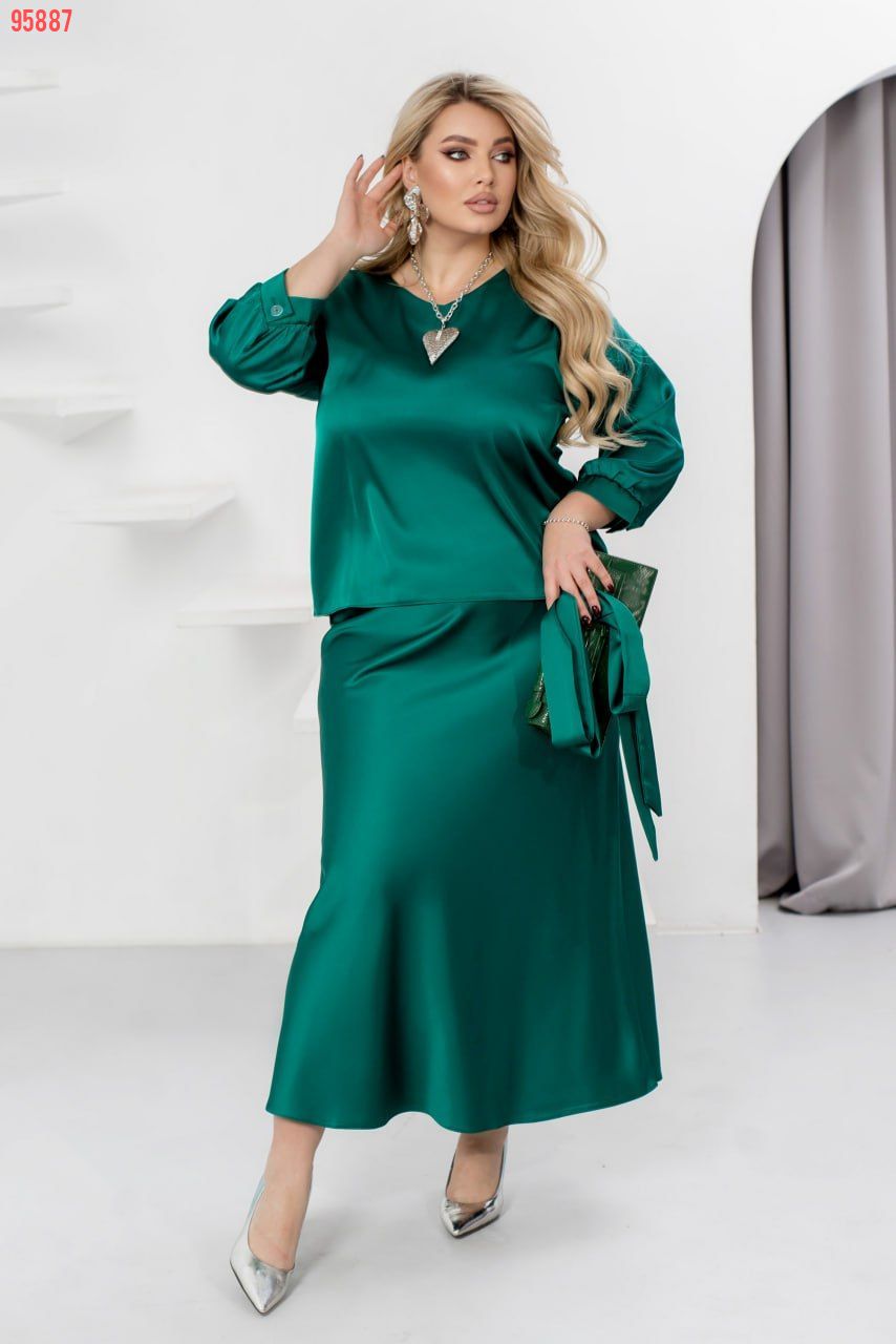 Елегантний святковий костюм зі спідницею, створений із розкішного костюмного шовку, стане вашим ідеальним образом для новорічних свят. Він поєднує витонченість і комфорт, роблячи вас зіркою будь-якої святкової події. Блуза з V-подібним вирізом створює акцент на зоні декольте, додаючи образу жіночності. Спущена лінія плечей та рукави довжиною 3/4 з манжетами на ґудзиках забезпечують стильний вигляд і зручність. Довга спідниця на резинці комфортно сідає по фігурі, а текстильний пояс, що входить до комплекту, дозволяє підкреслити талію та додає завершеності образу. Цей костюм створений, щоб ви відчували себе впевнено й виглядали розкішно під час зустрічі Нового року чи будь-якого іншого особливого заходу.