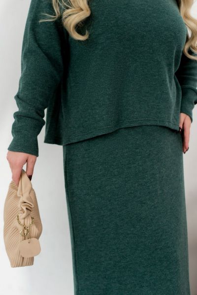 Стильний костюм, який складається з сукні та кофтинки, поєднує елегантність та комфорт в одному образі. Кофта з високою горловиною та довгими рукавами з манжетами виглядає дуже витончено, а занижена лінія плеча додає легкості та сучасного вигляду. Позаду кофтинка трохи довша, ніж спереду, що підкреслює її оригінальний стиль. Сукня максі-довжини, з прямим кроєм, створює елегантний силует, підкреслюючи витонченість фігури. Її V-подібний виріз горловини додає образу легкості та жіночності. Особливого шарму додає шов, що проходить по спинці, надаючи сукні вишуканого вигляду. Виготовлена з еластичної тканини, яка м’яко облягає тіло, сукня підлаштовується під ваші рухи, забезпечуючи максимальний комфорт і зручність. Ідеальний вибір для вечірки, урочистої події або важливого заходу, цей костюм гарантовано приверне увагу.