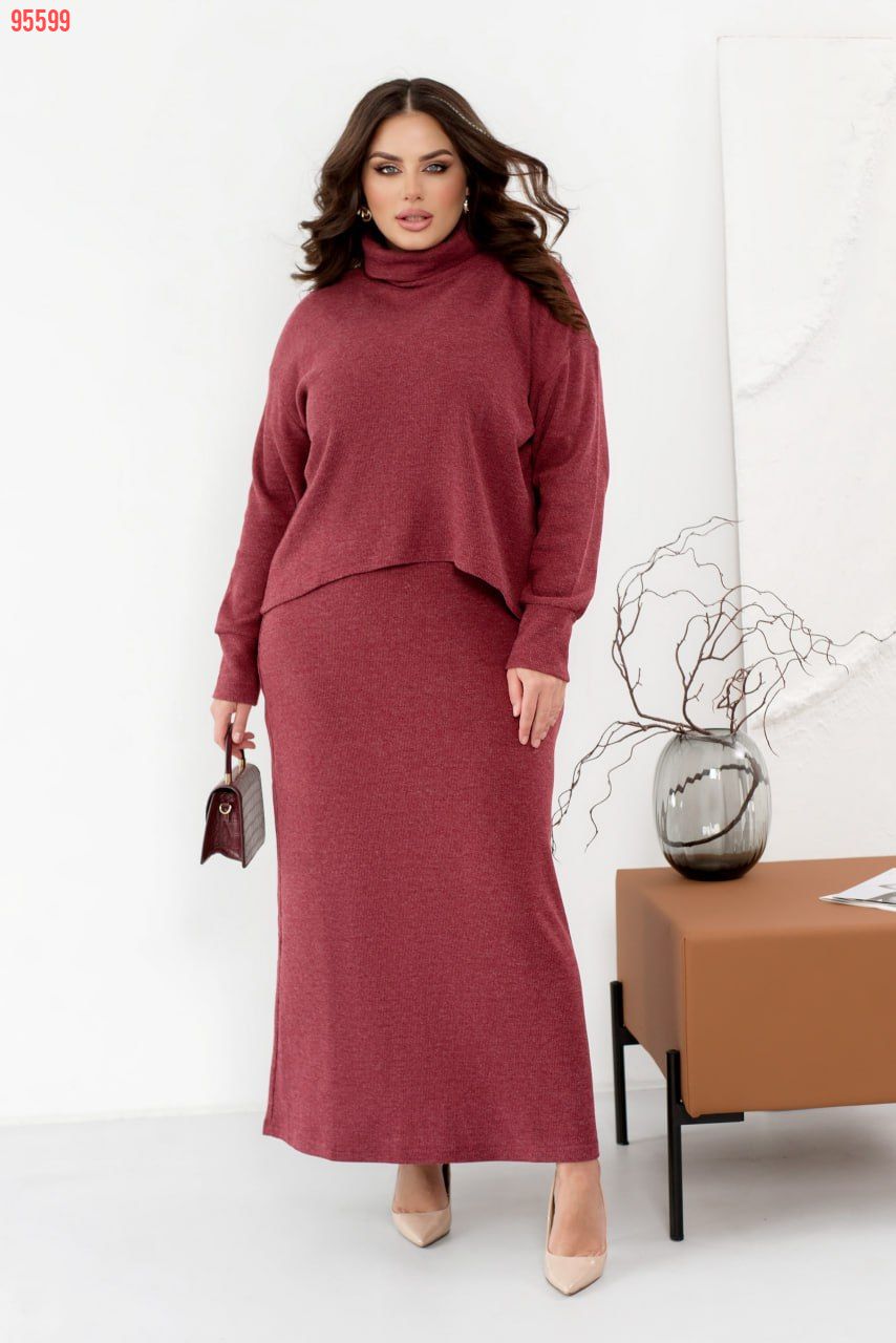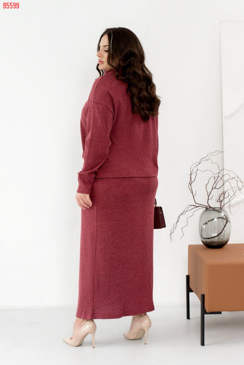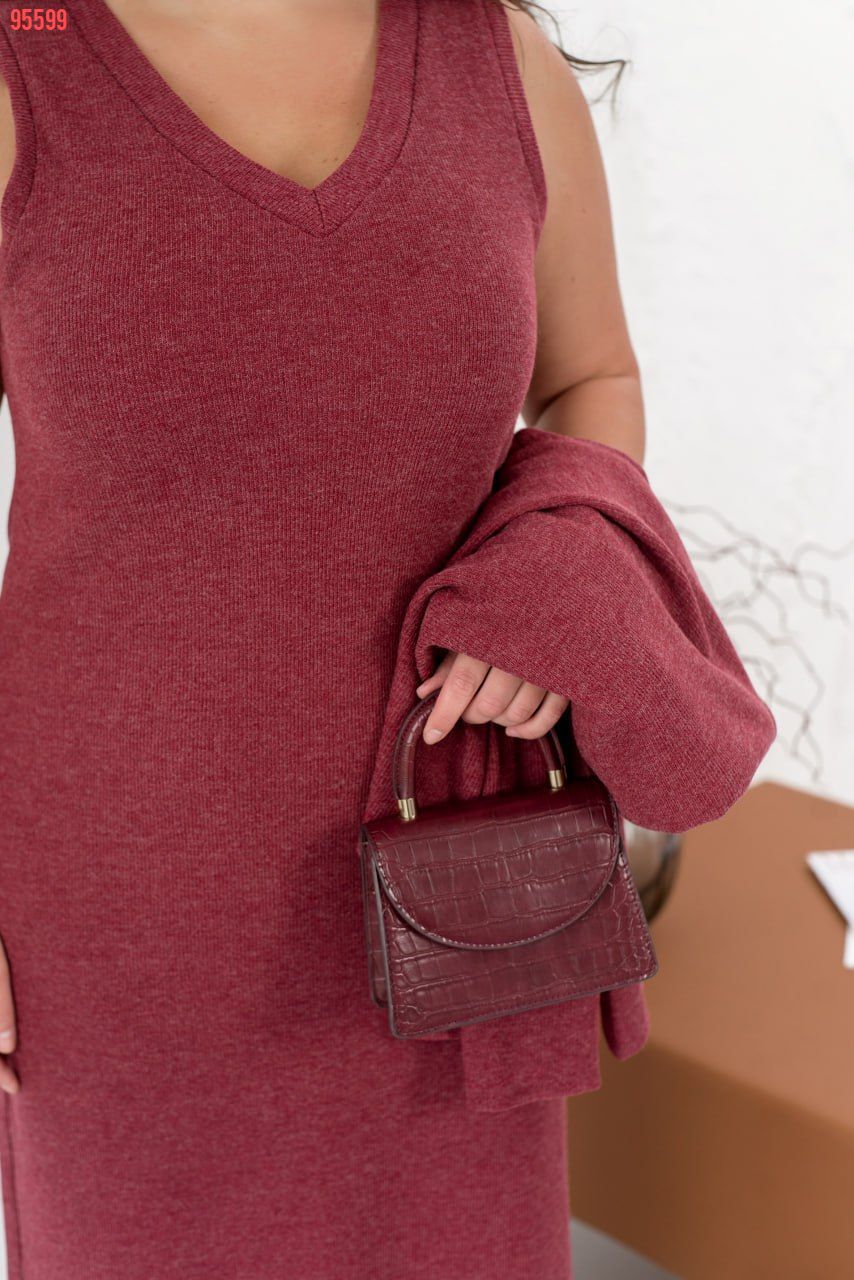 Стильний костюм, який складається з сукні та кофтинки, поєднує елегантність та комфорт в одному образі. Кофта з високою горловиною та довгими рукавами з манжетами виглядає дуже витончено, а занижена лінія плеча додає легкості та сучасного вигляду. Позаду кофтинка трохи довша, ніж спереду, що підкреслює її оригінальний стиль. Сукня максі-довжини, з прямим кроєм, створює елегантний силует, підкреслюючи витонченість фігури. Її V-подібний виріз горловини додає образу легкості та жіночності. Особливого шарму додає шов, що проходить по спинці, надаючи сукні вишуканого вигляду. Виготовлена з еластичної тканини, яка м’яко облягає тіло, сукня підлаштовується під ваші рухи, забезпечуючи максимальний комфорт і зручність. Ідеальний вибір для вечірки, урочистої події або важливого заходу, цей костюм гарантовано приверне увагу.