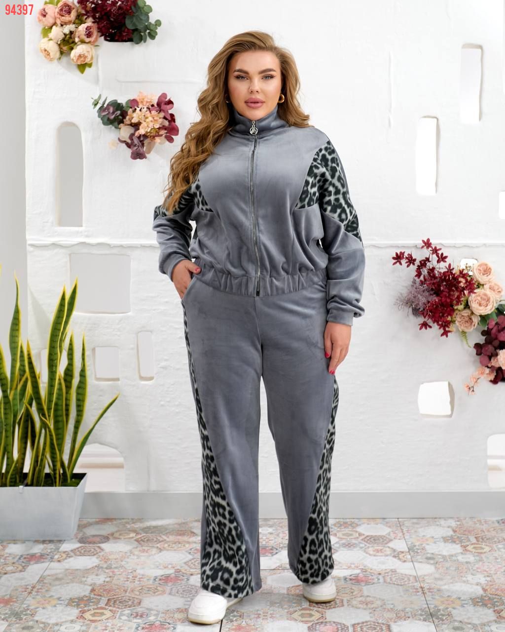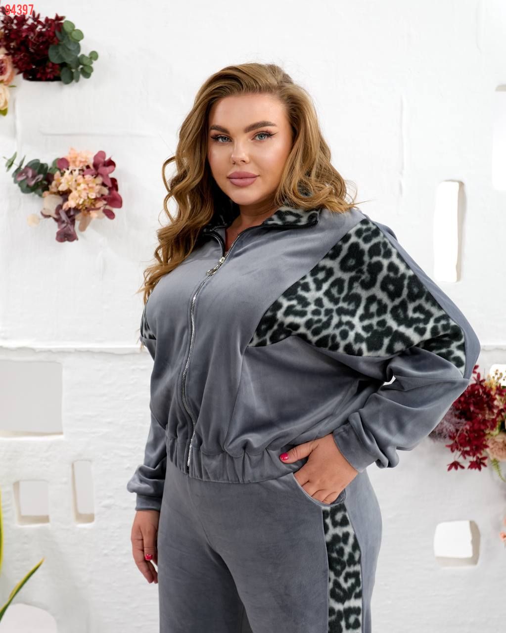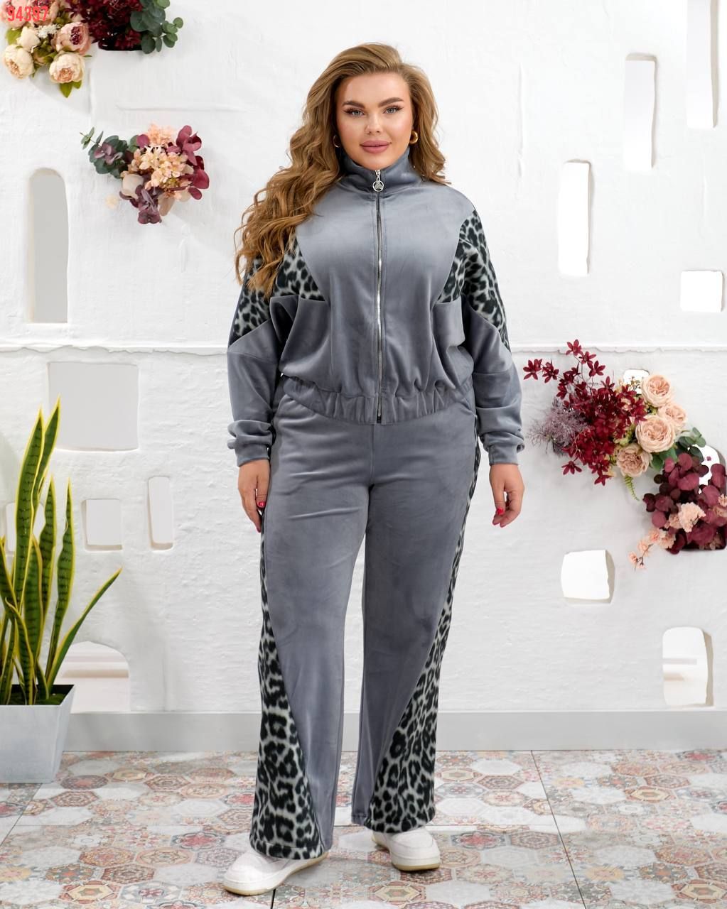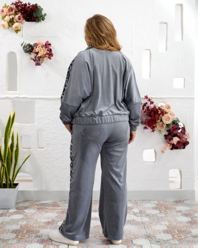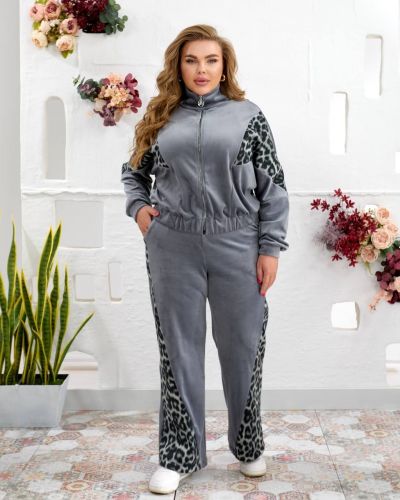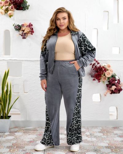 Костюм виконаний з якісної тканини Турецького велюру ,відмінний у носінні, приємний до тіла. Кофта вільного силуету з капюшоном , рукав реглан. Низ кофти на резинці можна корегувати довжину. Прикрашений вставками з лео. Рукав на манжеті. Штани палаццо, висока посадка. Оброблені кишені.