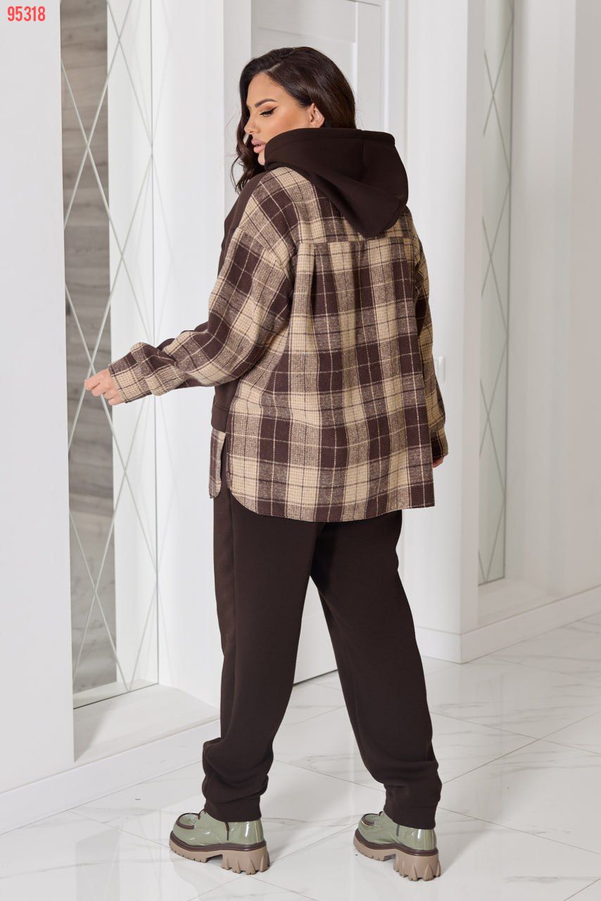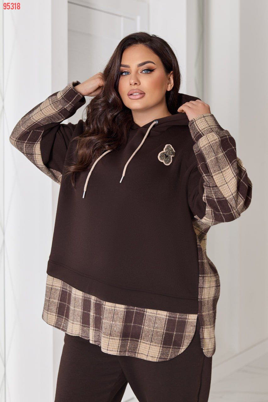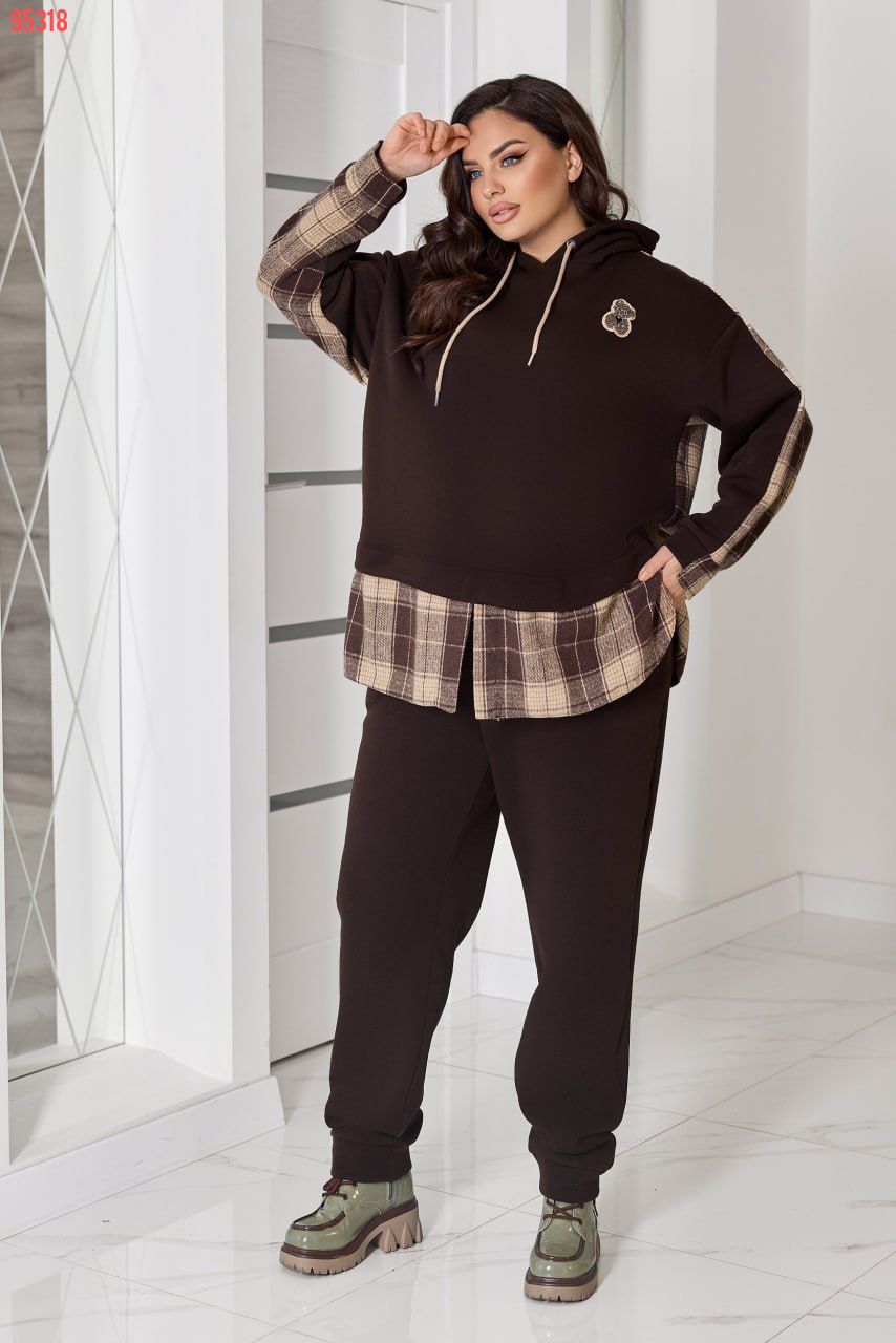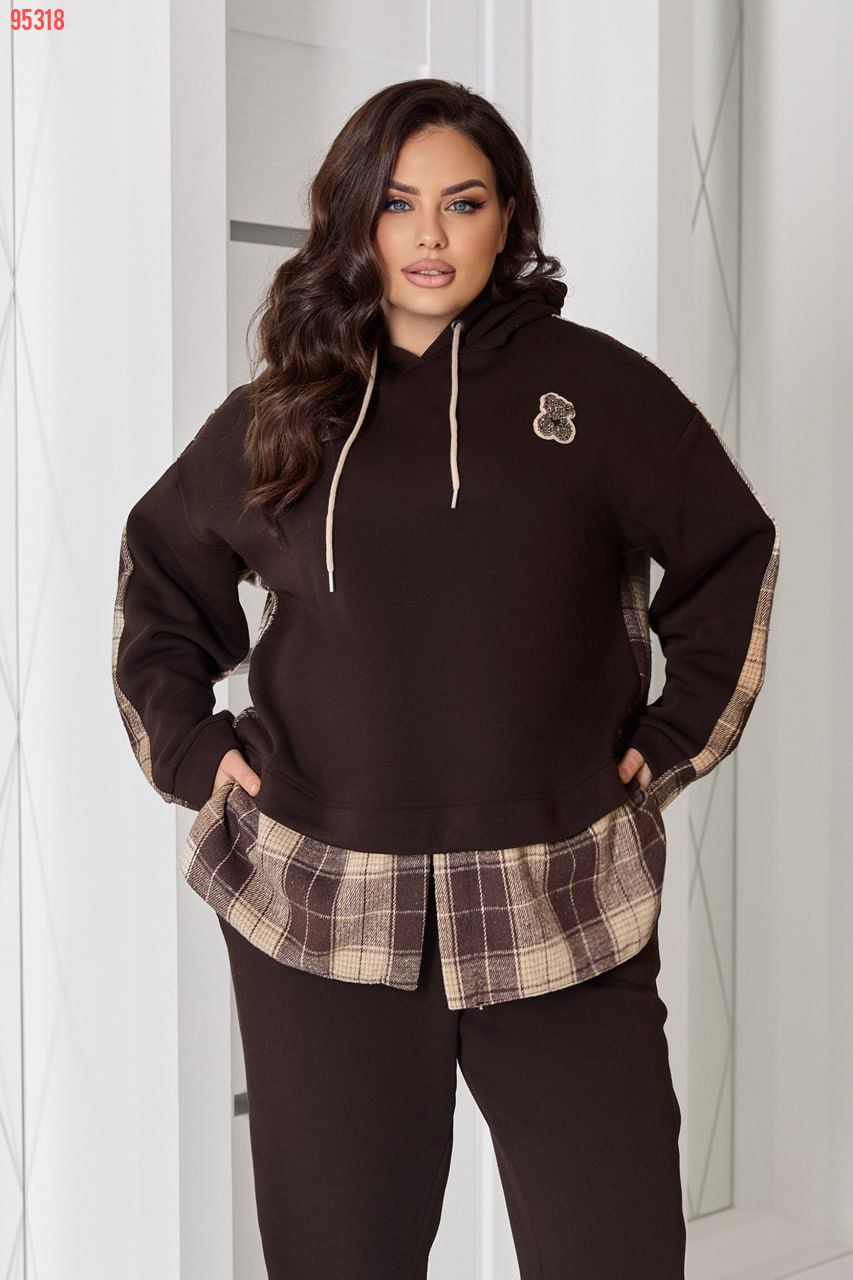 Комбінований теплий костюм із тринитки на флісі та байки в клітинку: штани середньої посадки на резинці з кишенями й оверсайз худі з капюшоном, розрізами з боків та трендовим декором «ведмедик». Ідеальний для затишних прогулянок та активних днів!