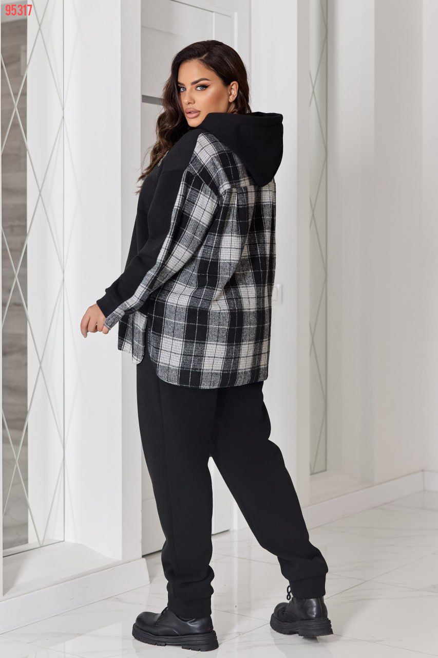 Комбінований теплий костюм із тринитки на флісі та байки в клітинку: штани середньої посадки на резинці з кишенями й оверсайз худі з капюшоном, розрізами з боків та трендовим декором «ведмедик». Ідеальний для затишних прогулянок та активних днів!