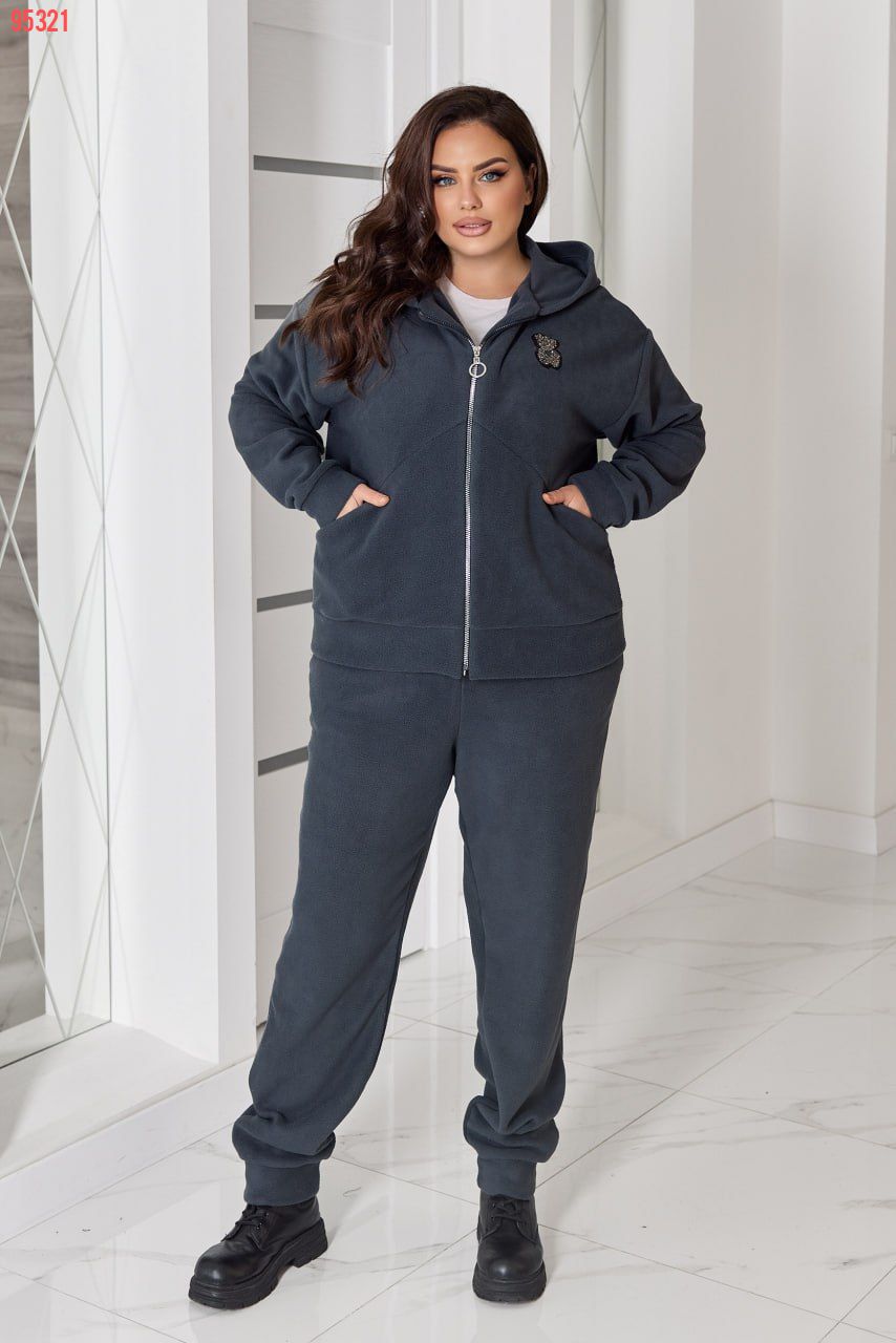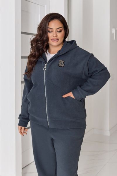 Теплий костюм з якісного флісу полар: штани зі зручними кишенями середньої посадки на резинці, кофта на блискавці по всій довжині з прорізними кишенями. Декор на кофті – трендовий «ведмедик», що додає образу акцент.