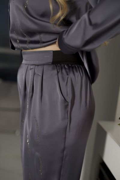 Брюки звужені донизу, з кишенями, пояс спереду виконаний із тканини, а ззаду має еластичну вставку-резинку для зручності посадки. Спереді брюки мають елегантні защіпи- для витонченості фігури.
