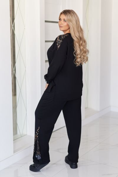 ●Штани прямого крою з високою посадкою, по боках лампаси та вставки з гіпюру, що створюють стильний акцент.