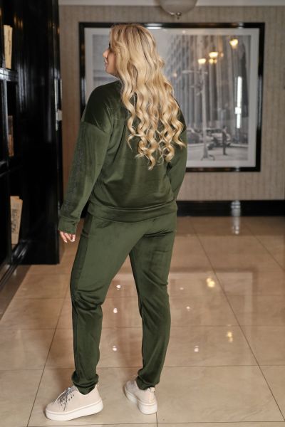 ●Штани на резинці з кишенями, низ оформлений манжетами. ●Лампаси зі стразами вздовж штанин візуально подовжують силует.