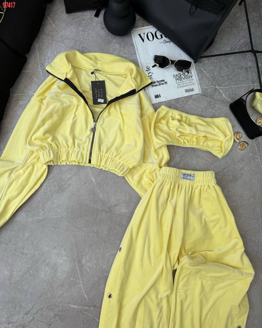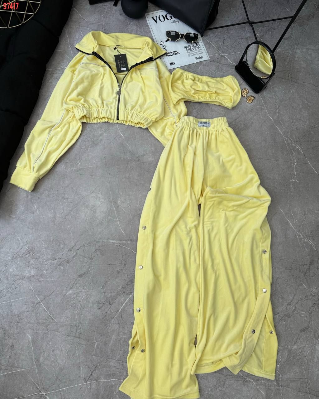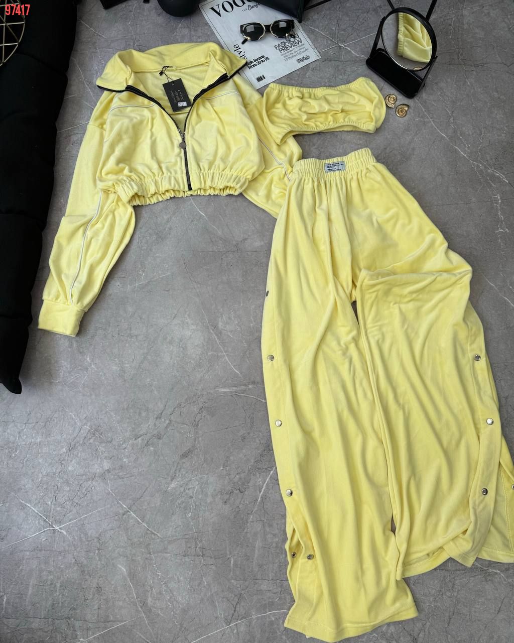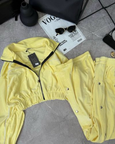Ідеальний костюм з приємного мʼякого велюру. Складається з кофти, топу бандо та штанів на закльопках по боках. Кофта йде вкорочена на змійці, з кантом. Топ на резинці.