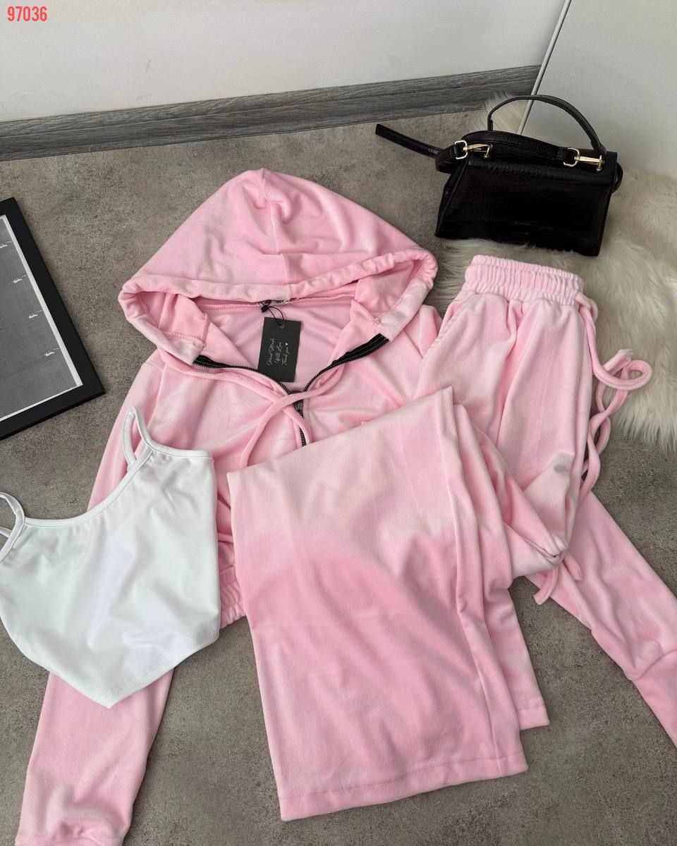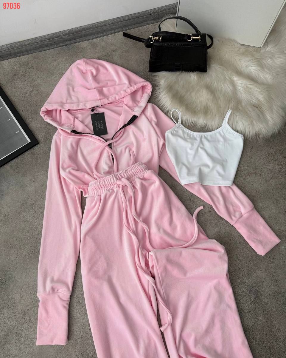 Дуже практичний костюм з кофти, штанів та топу - ідеально до будь-якого сезону. Приємна мʼяка тканина. Кофта на змійці та з капюшоном. Штани на резинці та мають кармани. Топ на бретелях, тягнеться по фігурі.