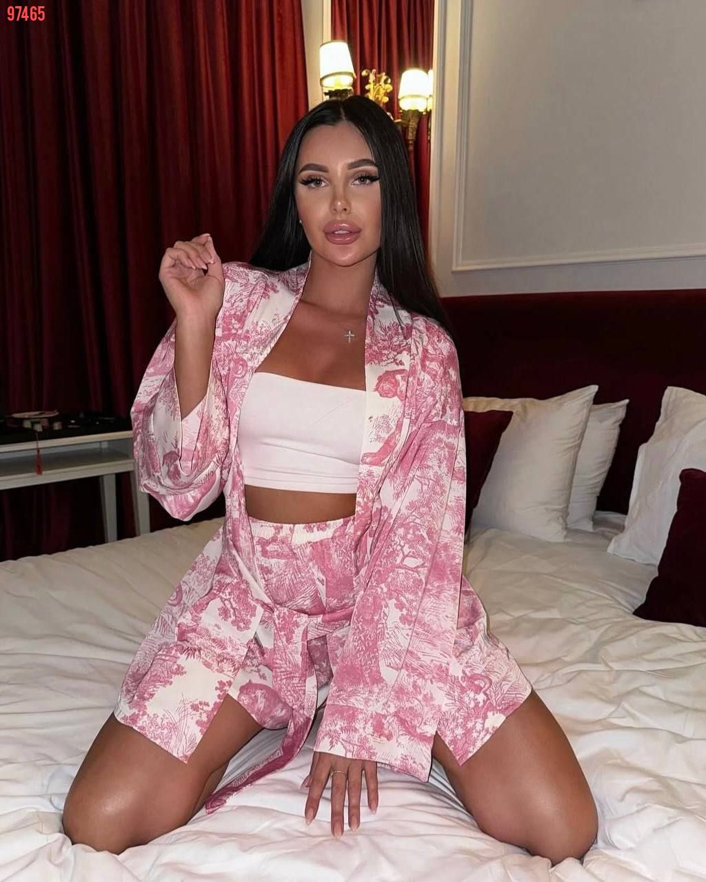 Цей костюм трійка знахідка на літо - кімоно з поясом + топ + шорти. Легка приємна до тіла тканина, не просвічується. Топ гарно тягнеться та сідає по фігурі. Шорти на резиночці, з розрізами.