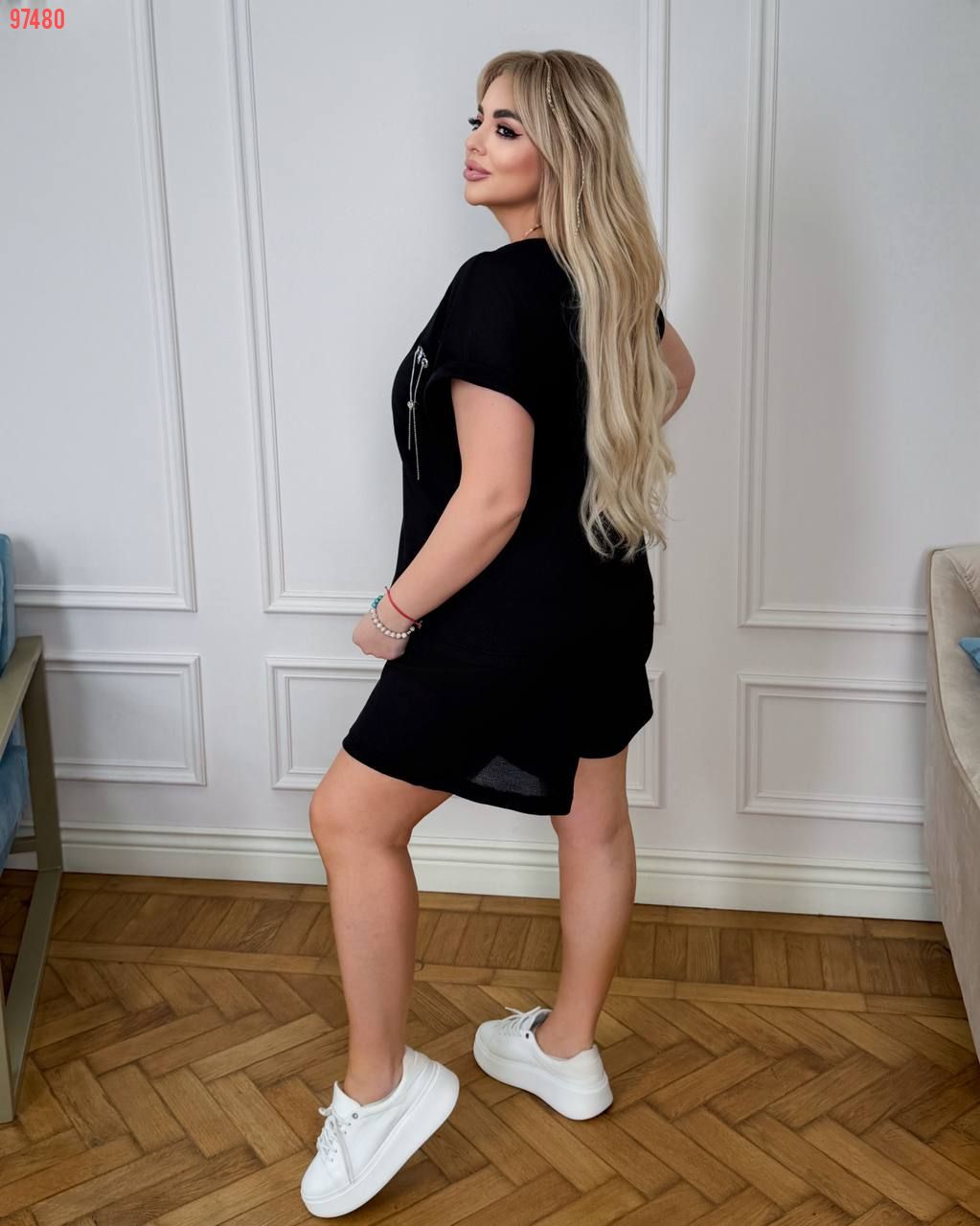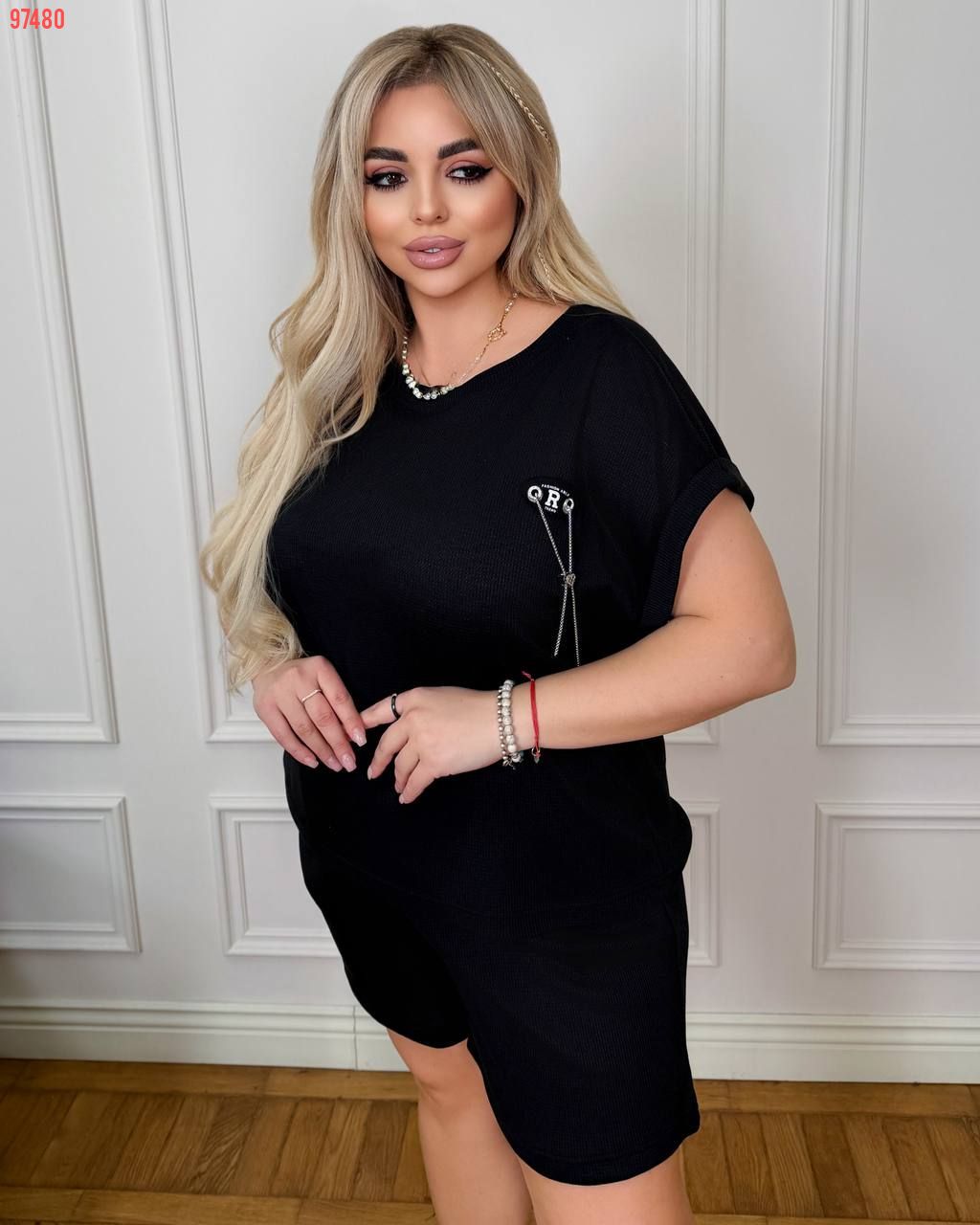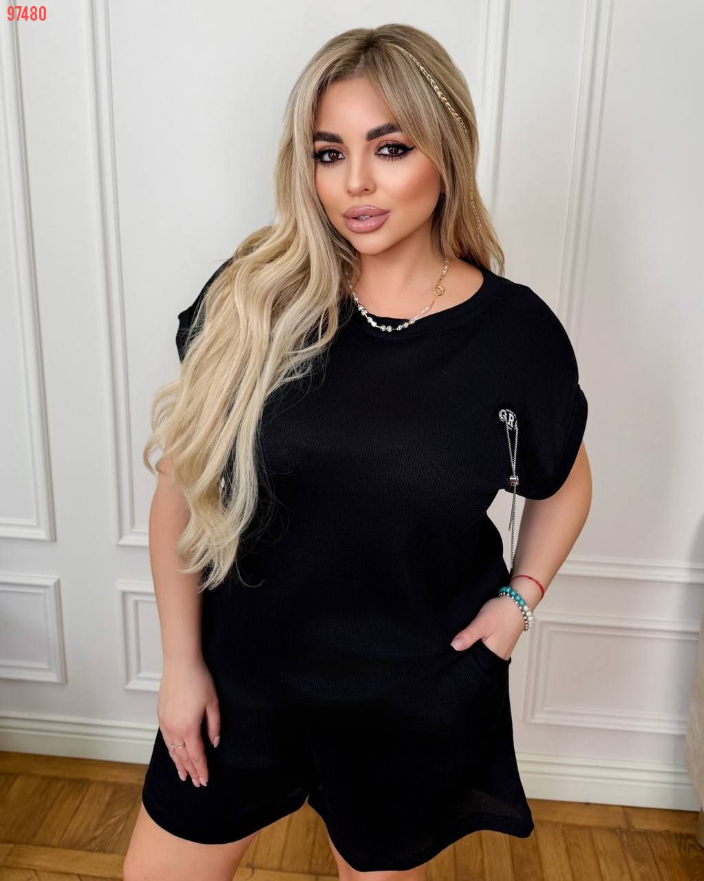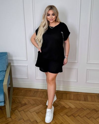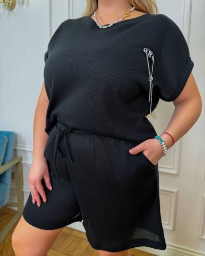 Костюм з трикотажу стрейч «вафелька»: футболка з манжетами на рукавах та Акс + шорти з високою посадкою на гумці, з кішкнями у бічних швах та шнурком на поясі