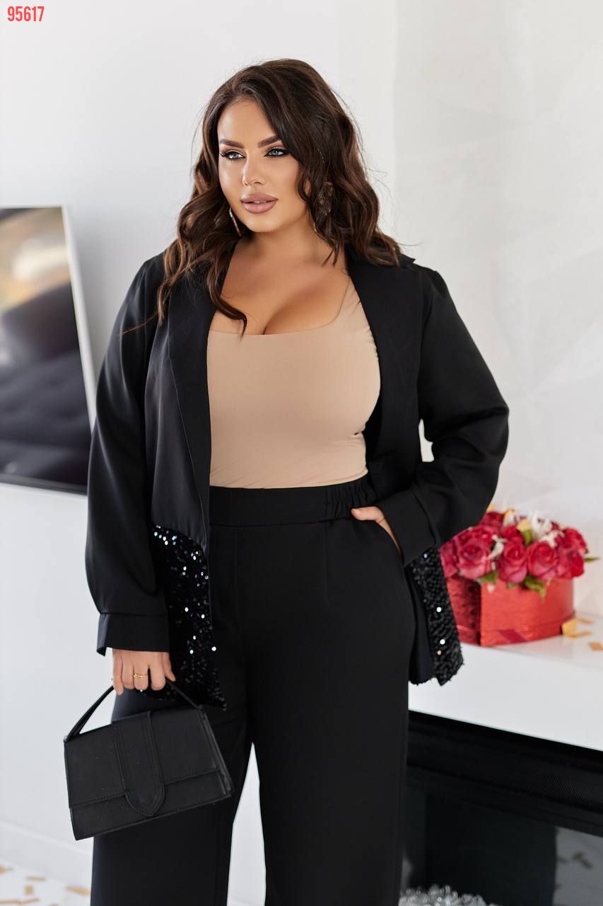 Стильний жіночий костюм .Подовжений піджак, прямого крою, з класичним коміром .Широкі штани. Цей костюм відмінно підійде для повсякденних, ділових та стильних образів, святкових вечорів