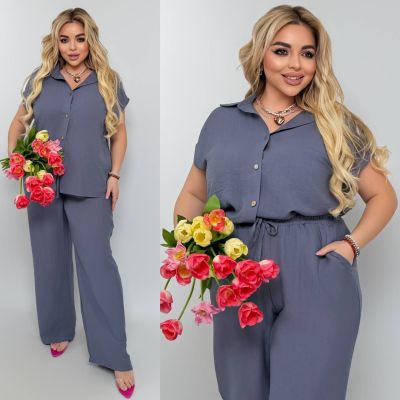Костюм з легкого льону: штани з посадкою вище середнього на гумці та куліскою на поясі, з кишенями у бічних швах + сорочка на ґудзиках