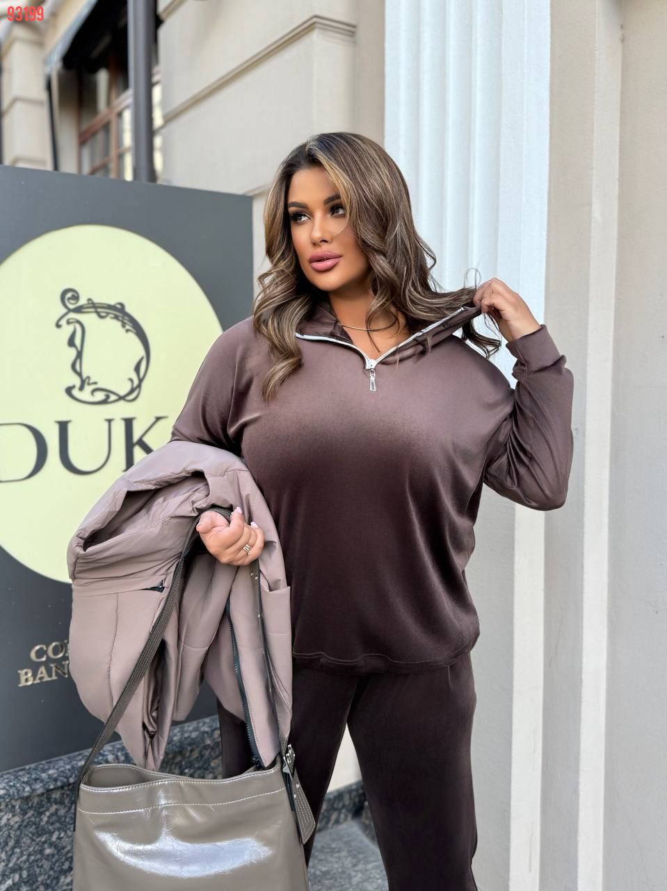 Пояс на резинці+ канат, манжет знизу штанів, рукав реглан, для зручності є затяжка в кофті, капюшон не знімається, блискавка робоча