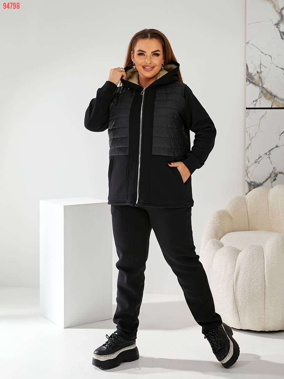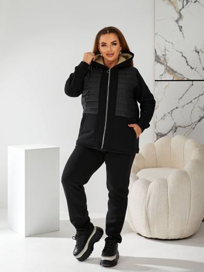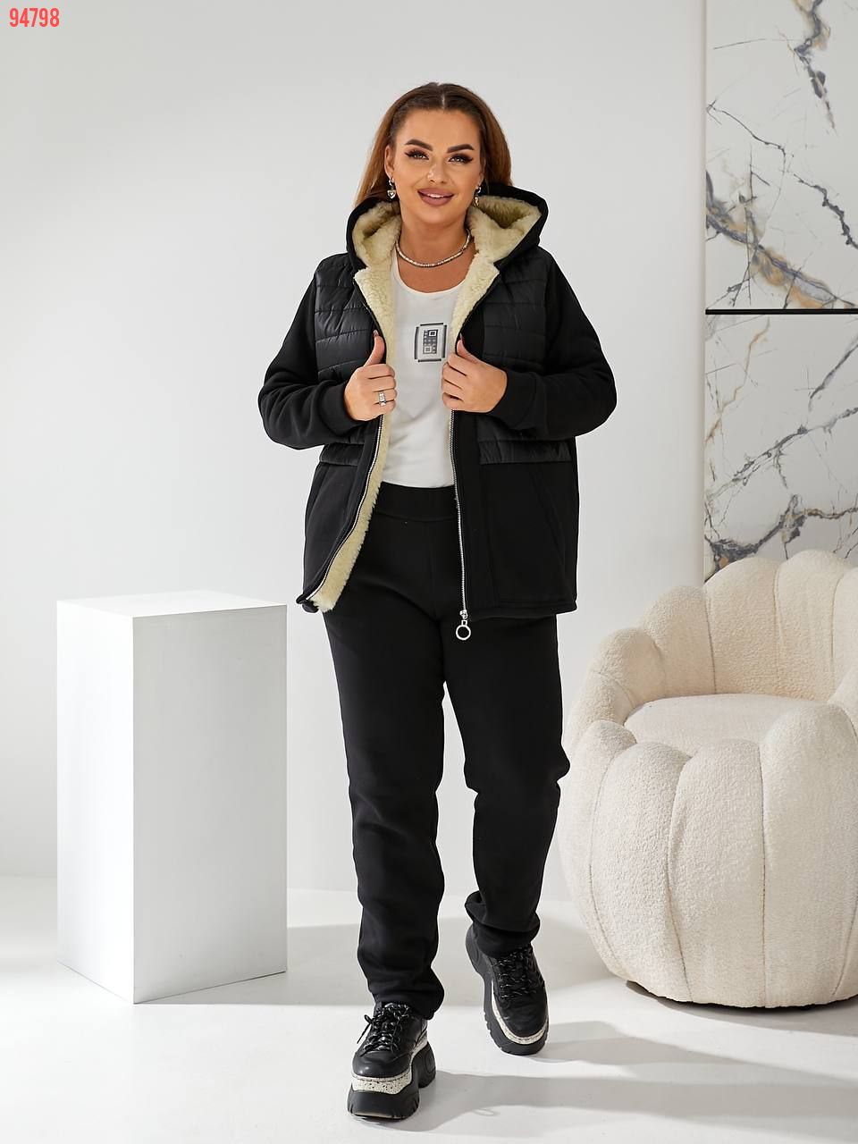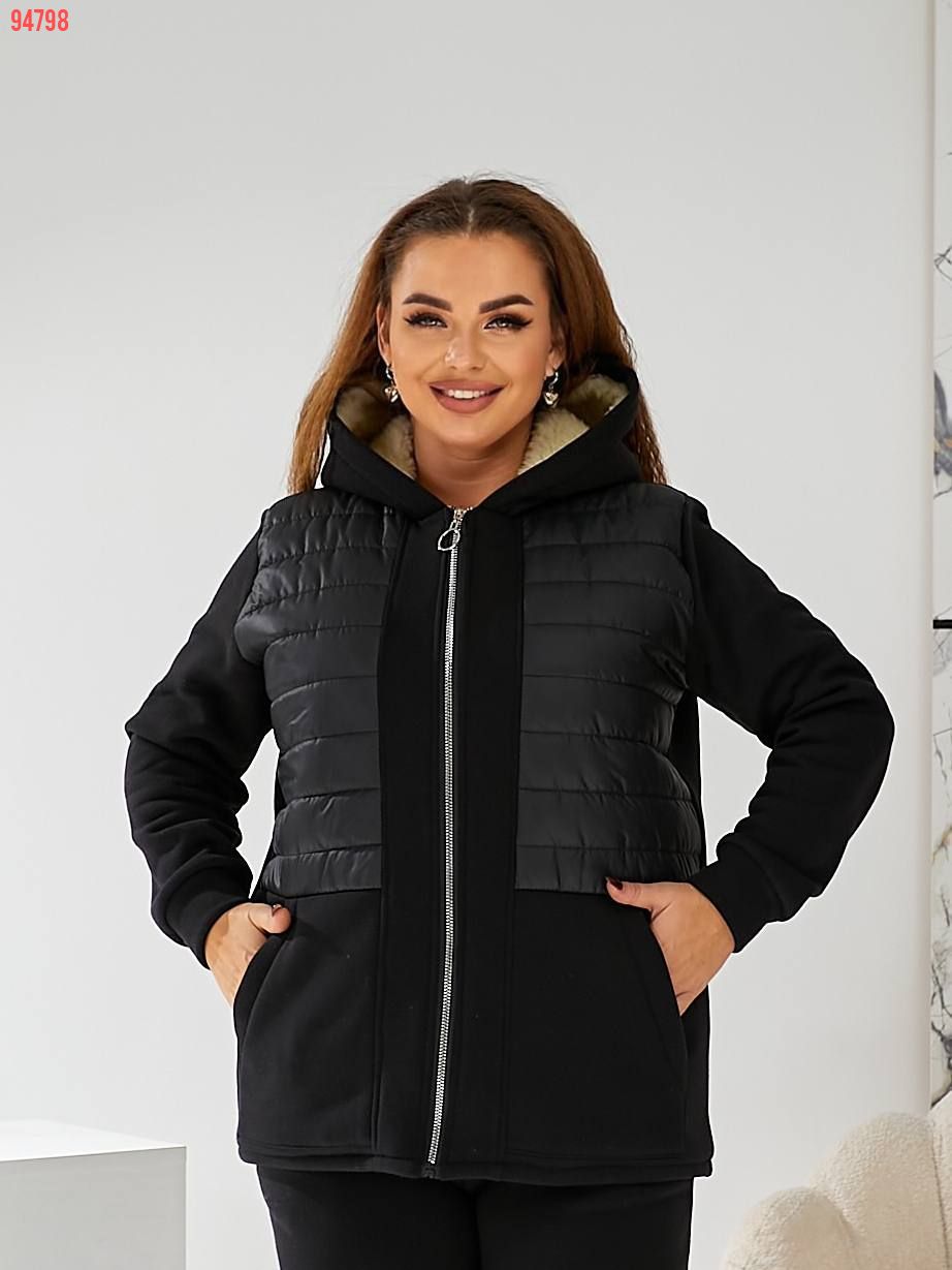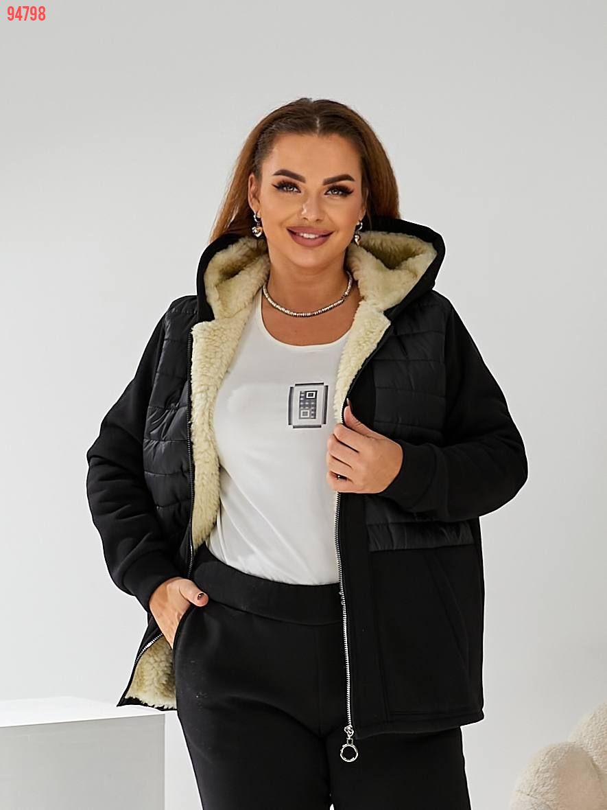 Тканина: трикотаж 3-х нитка начіс, підклад (поличка та спинка, капюшон) штучна овчина