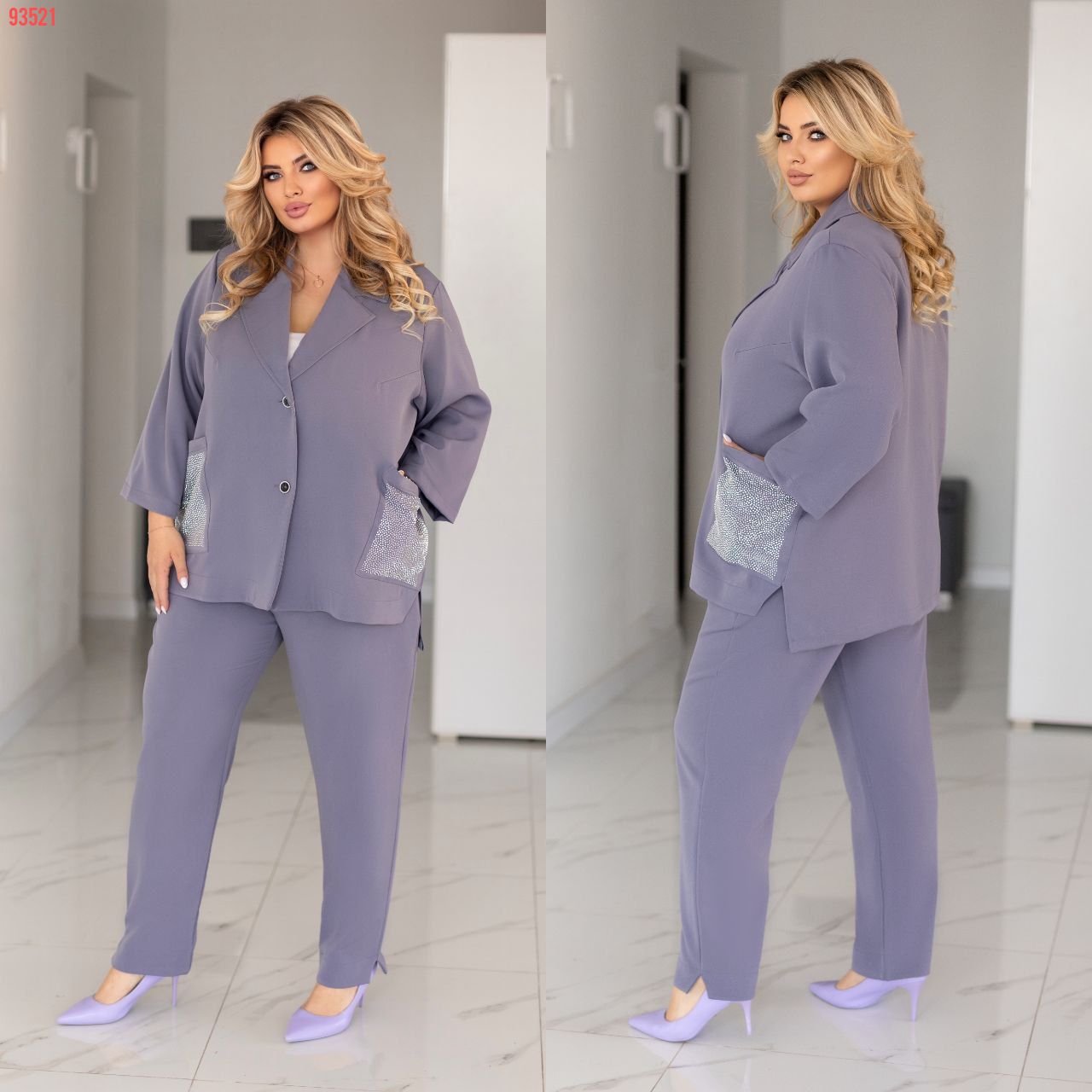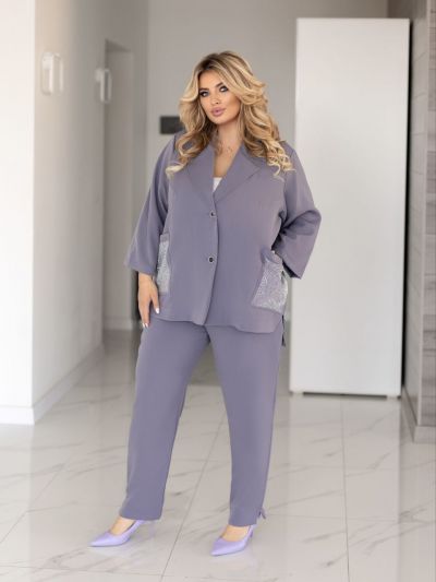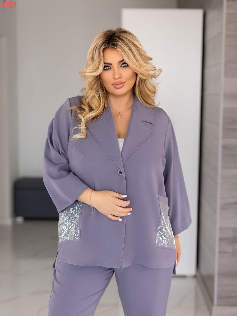 Святковий, діловий костюм двійка підійде для будь-якого свята Дуже стильний та гарний костюмчик. Костюм вільний . Спинка піджака продовжена по бокам має гарні вирізи , кишені оздоблені стразами які дуже сяють. Штани на резінці з двома кишенями штани по низу по боковому шву мають розрізи. На моделі 52-54 р. Параметри моделі: Обхват грудей -115см Обхват стегон -118 см Зріст -165 см