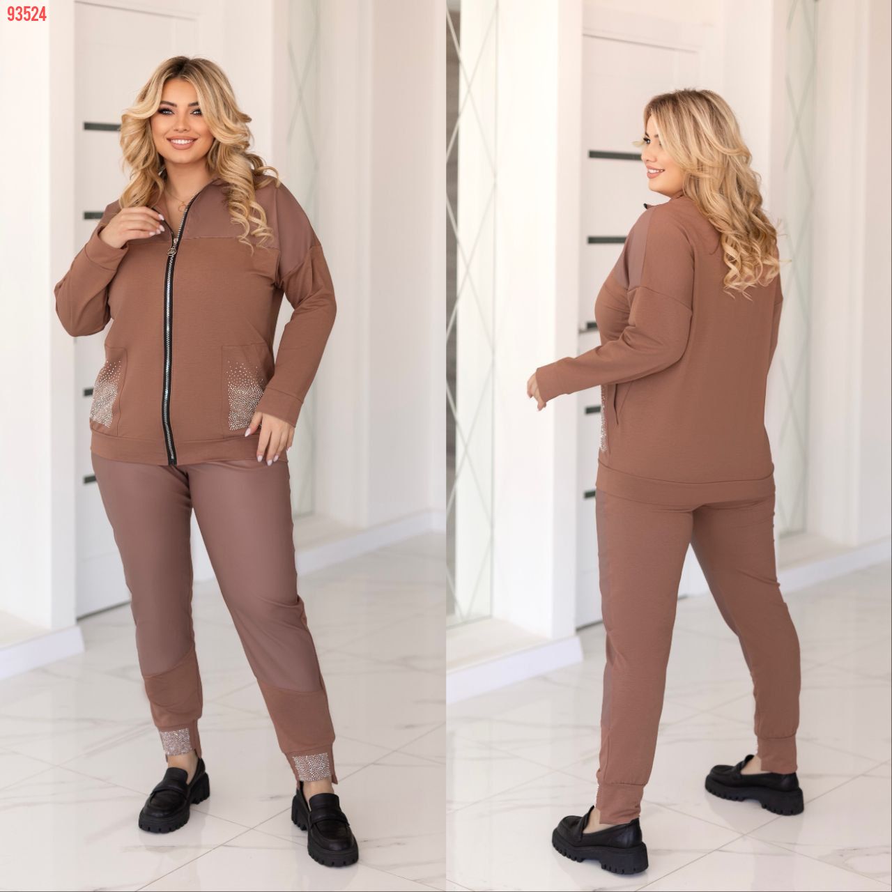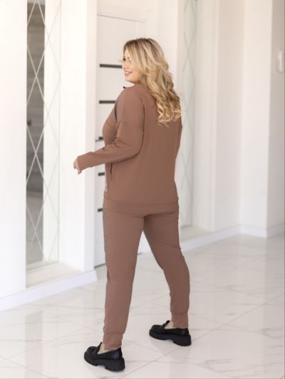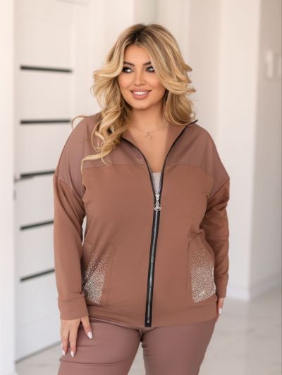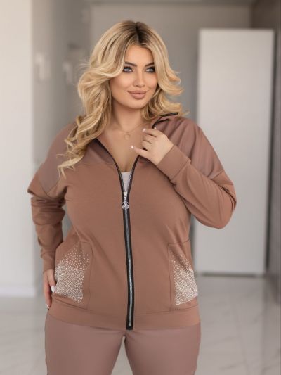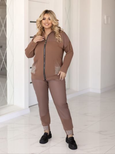 Прекрасний костюм в стилі спорт шик кофтинка з кишенями які оздоблені стразами . Штани на резінці, з кишенями на манжеті теж стрази Посадка штанів висока. ,пояс пошитий на поясній машинці, зручний, прикольний костюм.