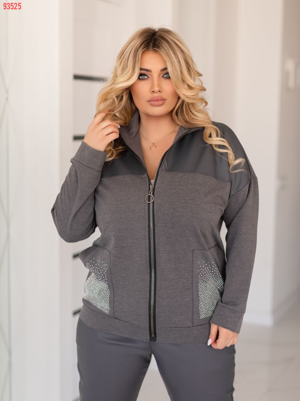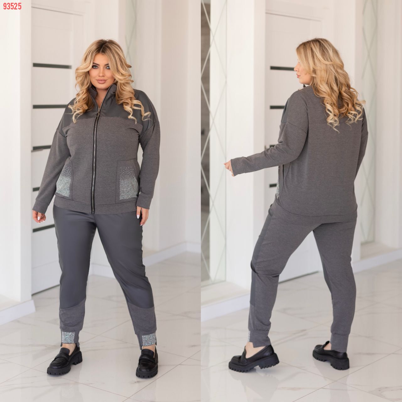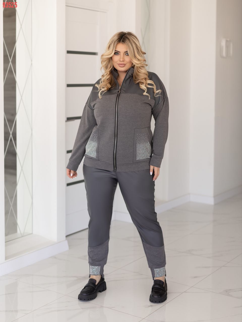 Прекрасний костюм в стилі спорт шик кофтинка з кишенями які оздоблені стразами . Штани на резінці, з кишенями на манжеті теж стрази Посадка штанів висока. ,пояс пошитий на поясній машинці, зручний, прикольний костюм.