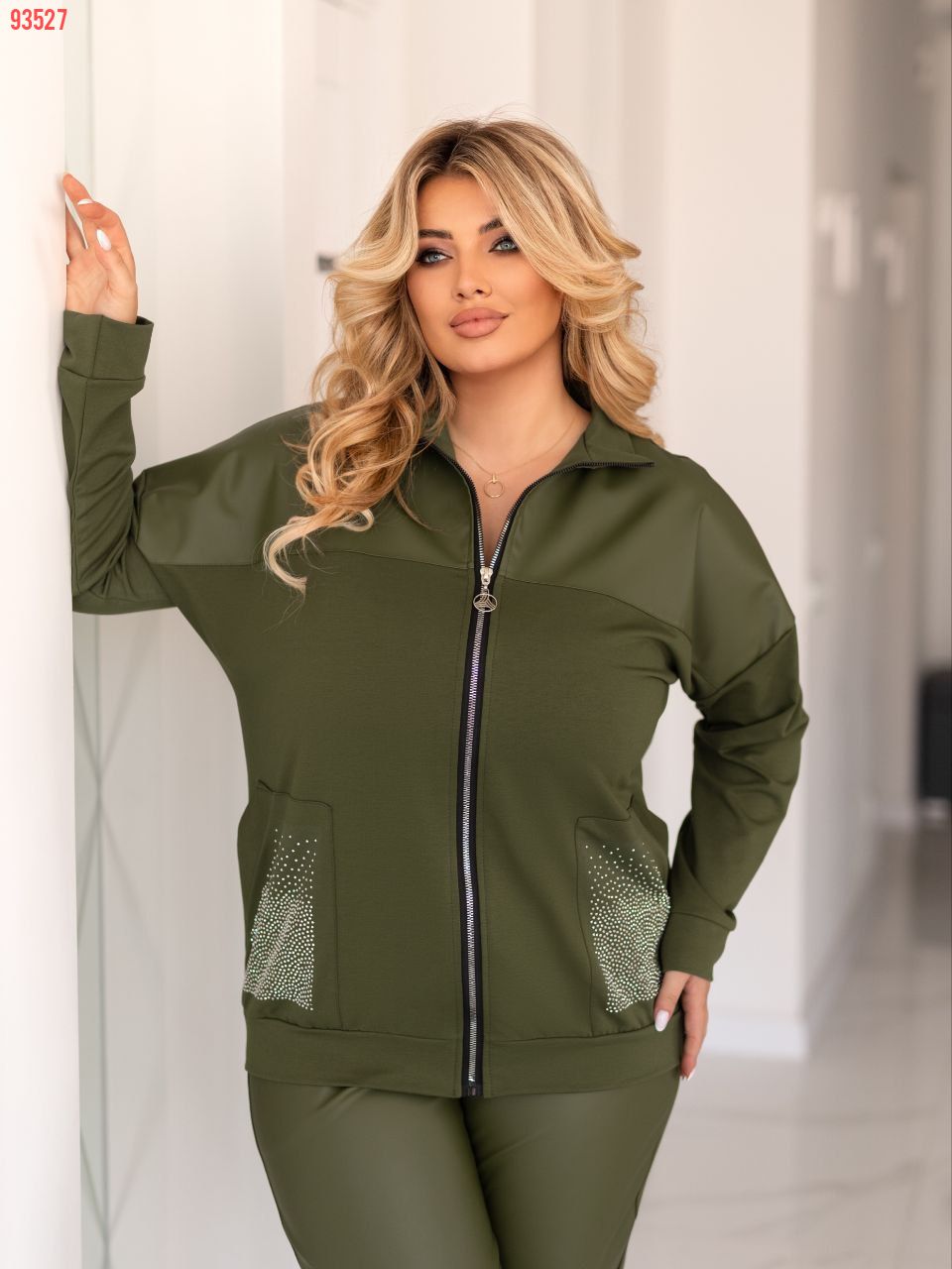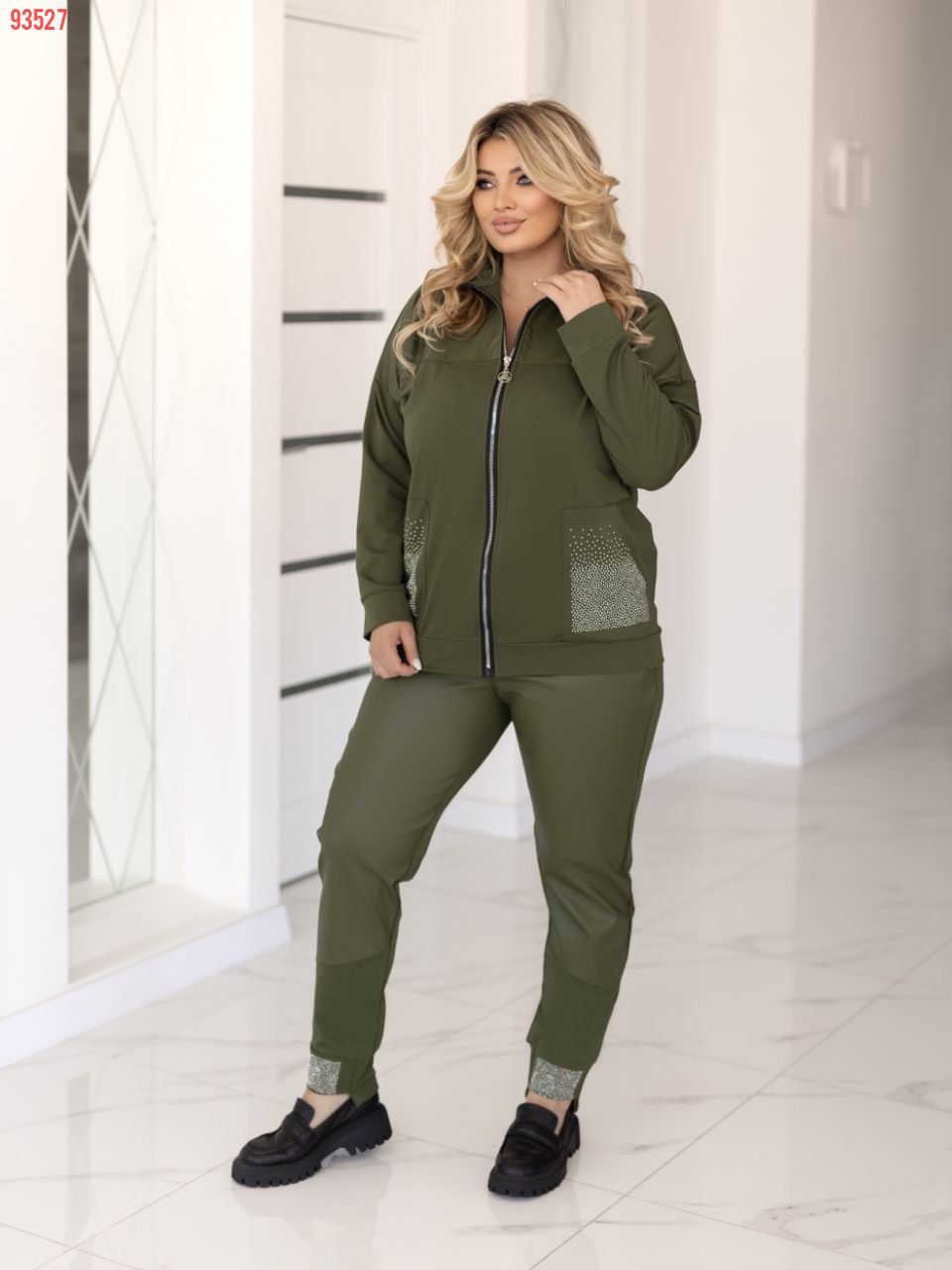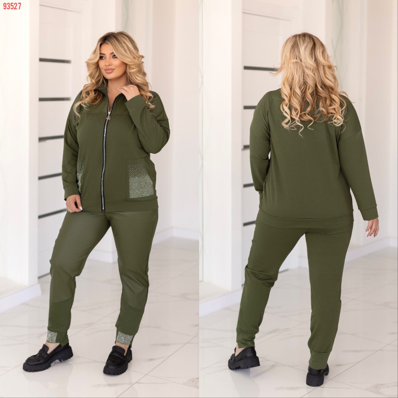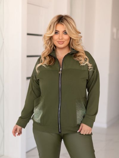 Прекрасний костюм в стилі спорт шик кофтинка з кишенями які оздоблені стразами . Штани на резінці, з кишенями на манжеті теж стрази Посадка штанів висока. ,пояс пошитий на поясній машинці, зручний, прикольний костюм.