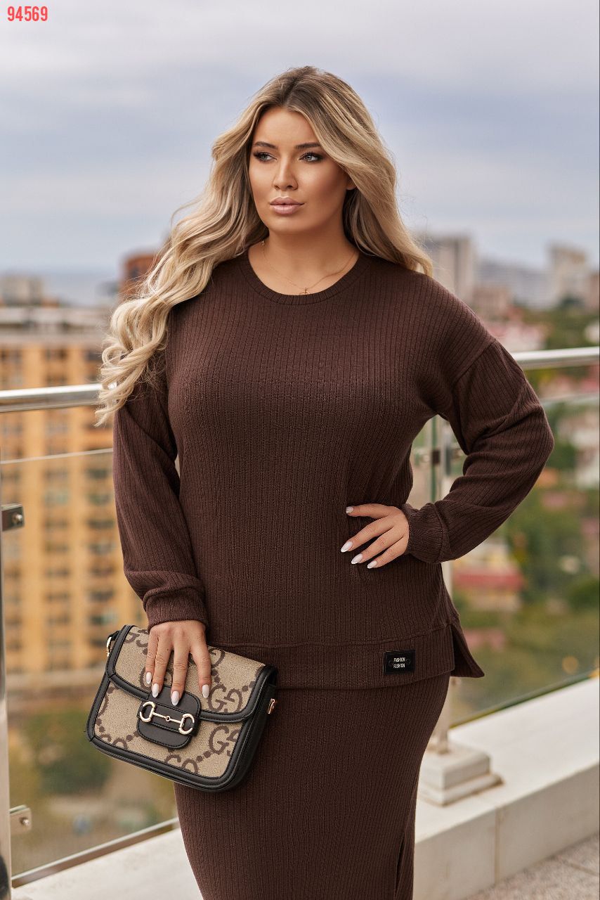 Костюм складається з светра та спідниці, виготовлений з ангари. Цей комплект ідеально поєднує в собі комфорт, тепло та жіночність, створюючи елегантний образ для будь-якого випадку.