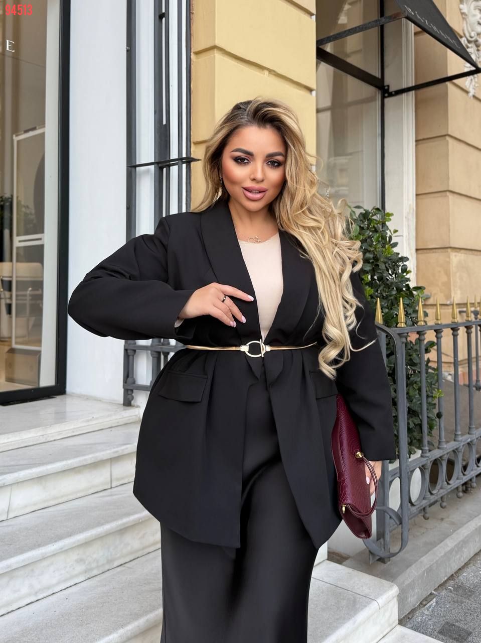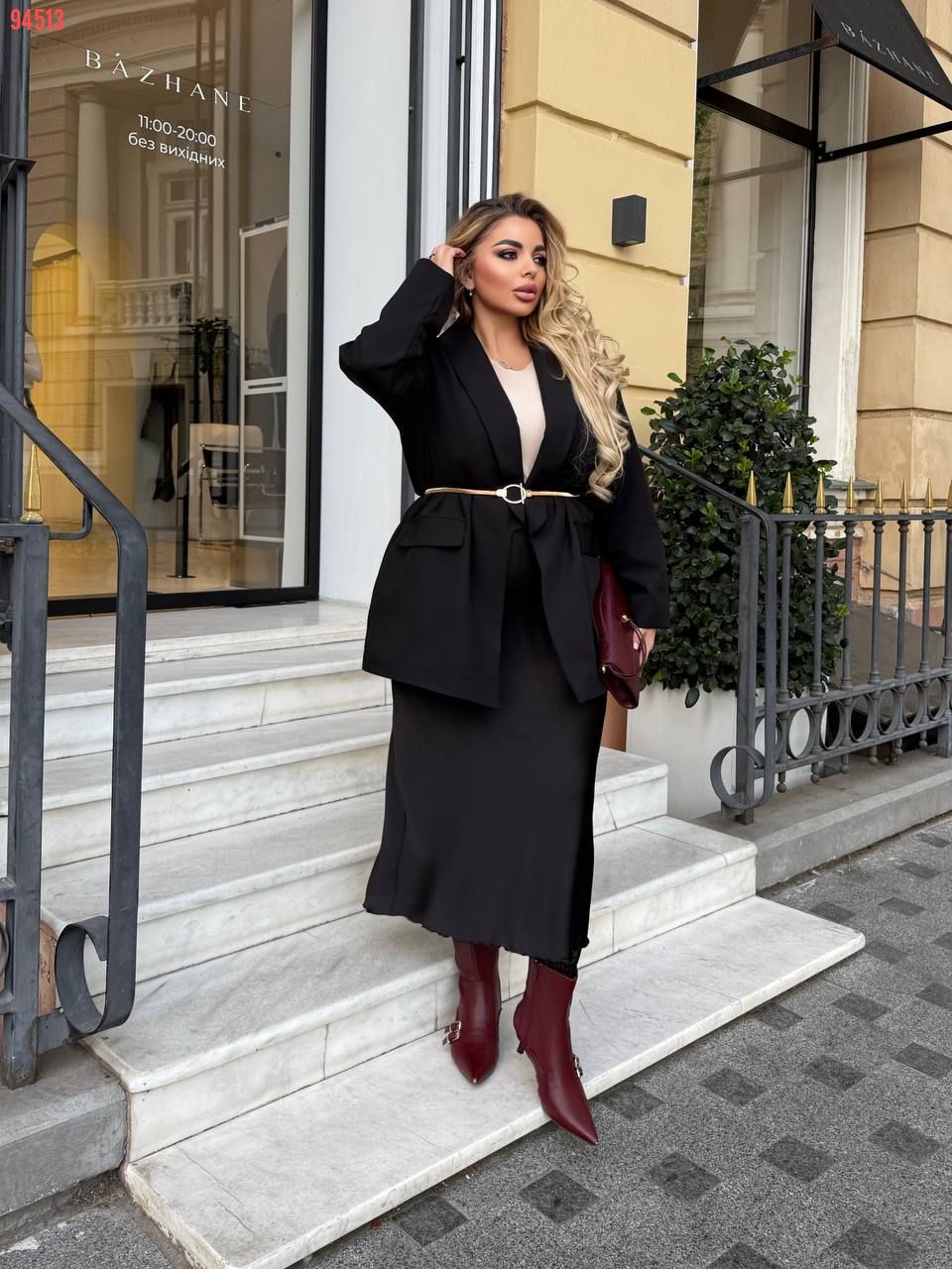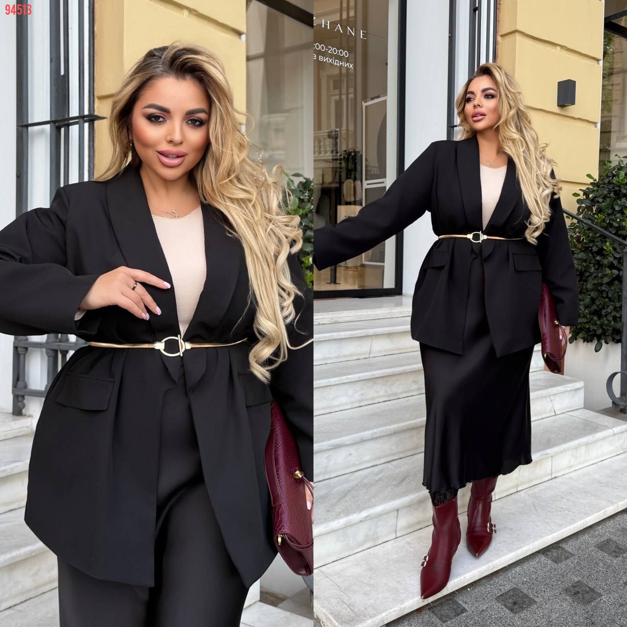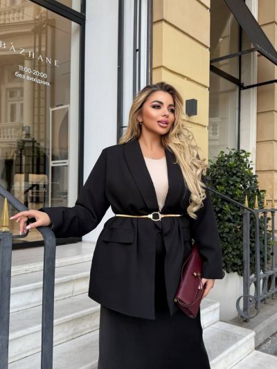Матеріал: костюмна тканина – щільна, м’яка та тримає форму. Піджак має підкладку та підплечники.