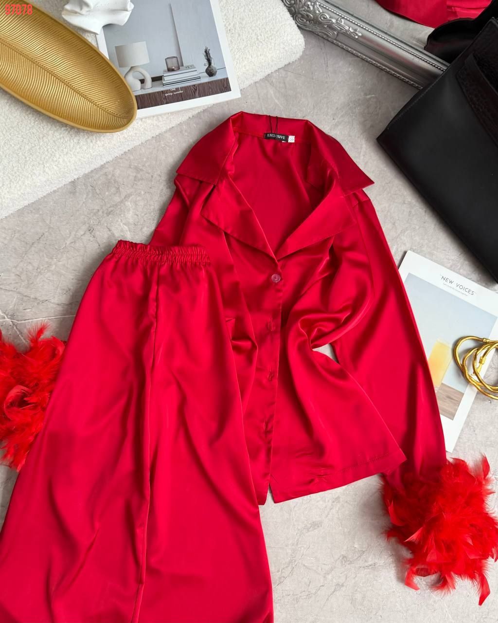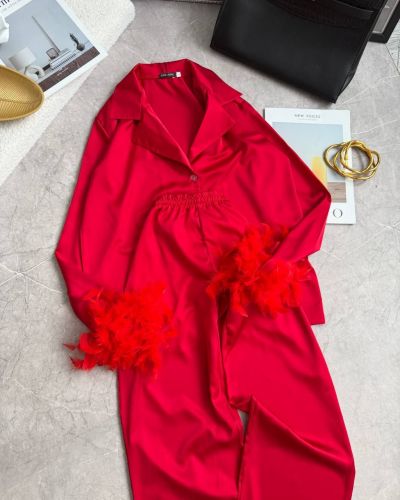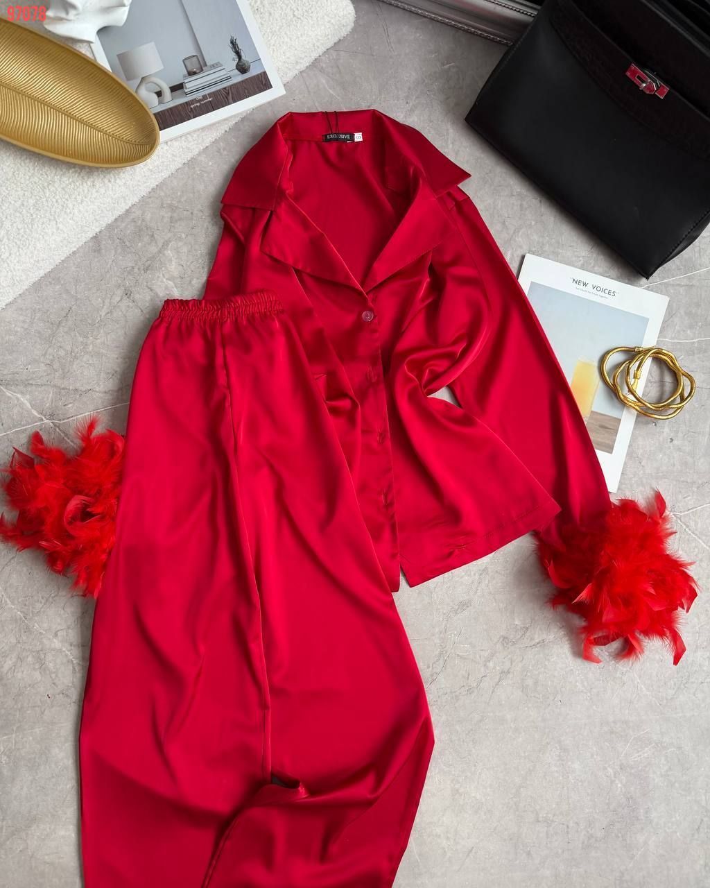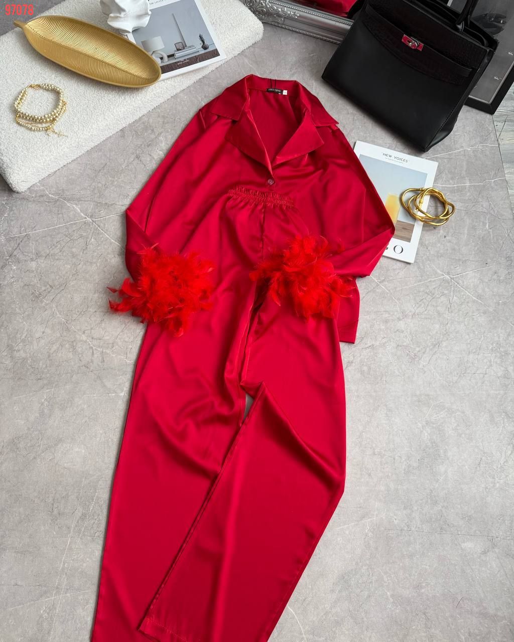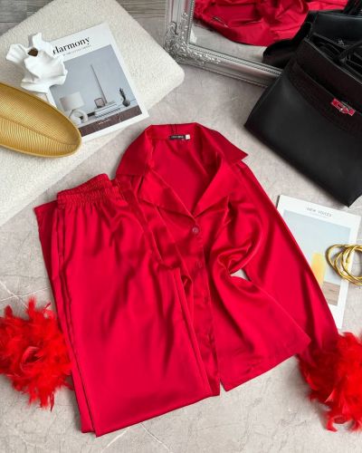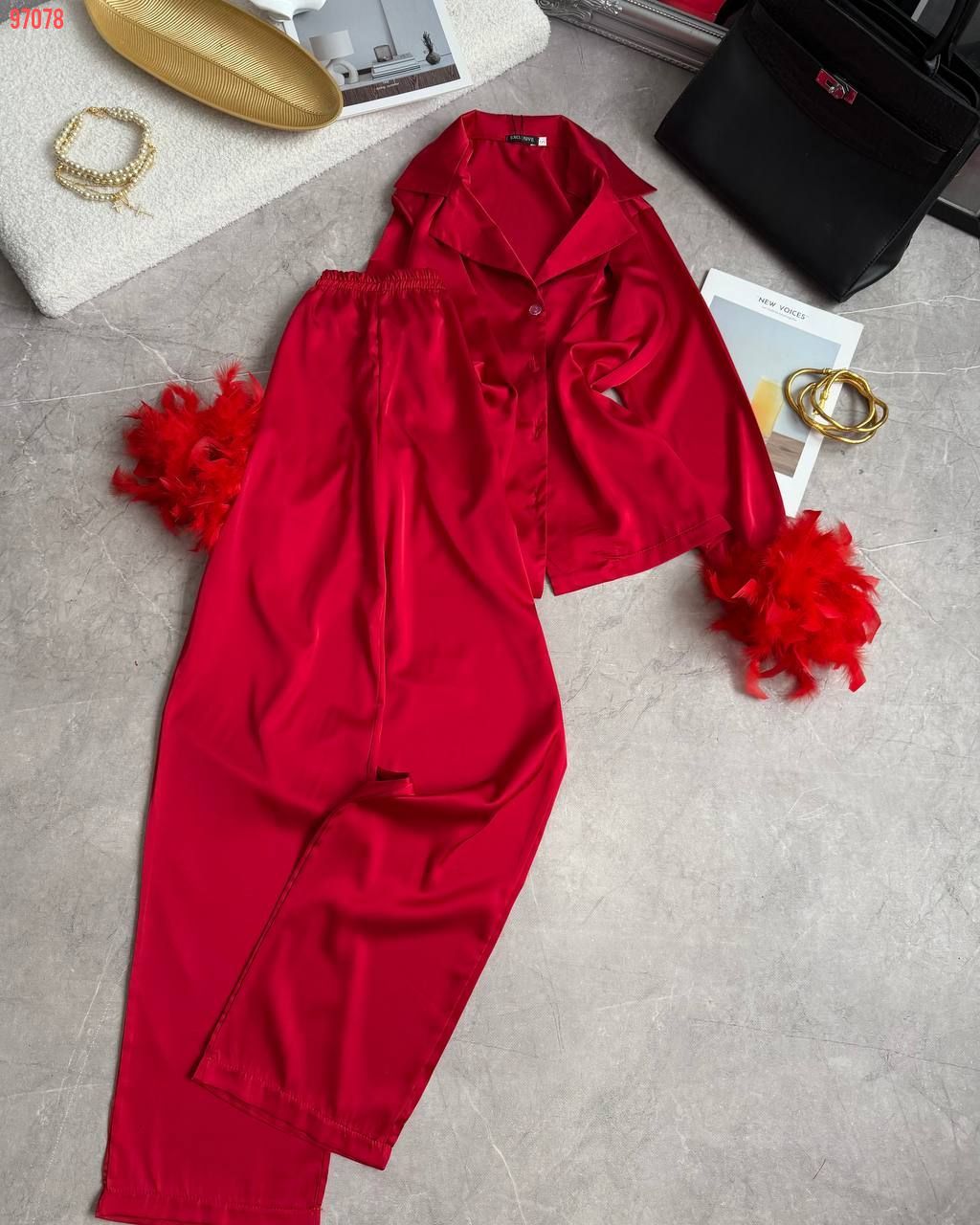 Вишукана піжама з шовку з пірʼям на рукавах, з сорочки та штанів. Дуже легка та приємна до тіла. Ідеально на подарунок або фотосесій.
